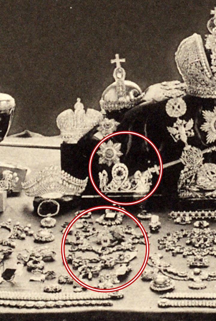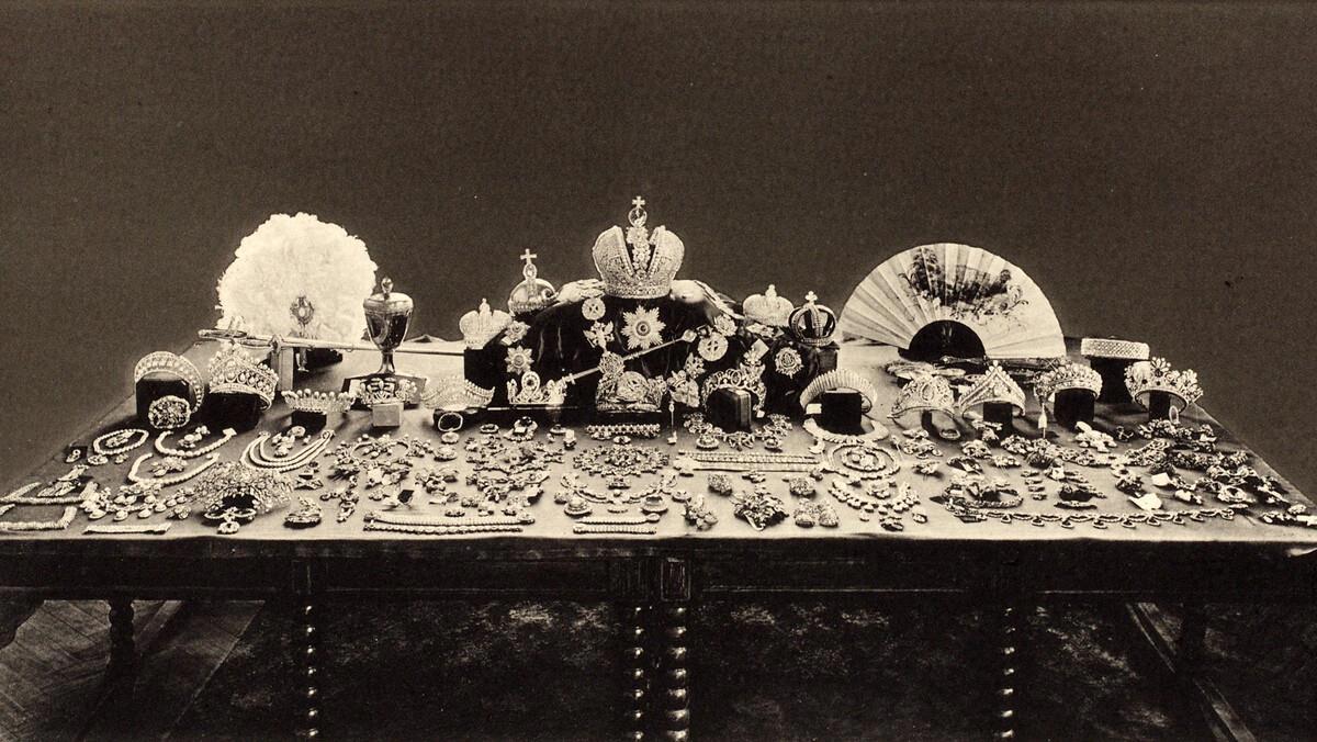 Знаменитое фото основной части российских коронных драгоценностей и драгоценностей Императриц, сделанное советской комиссией в 1922 г. На столе представлены 13 диадем + 4 короны, диадема-бандо с пчёлками, скипетр, держава и другие ценности, привезённые в Московский Кремль.