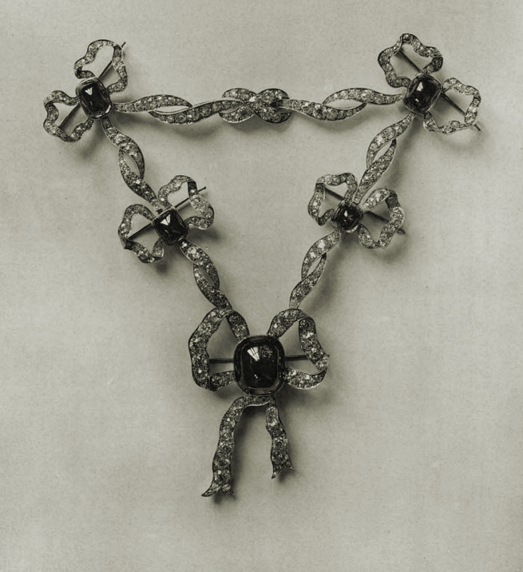 Позже к диадеме и ожерелью примкнула корсажная брошь (Plastron), которую, ввиду срочности работы, исполнил Кнут-Оскар Пиль, мастер московского отделения фирмы Фаберже.