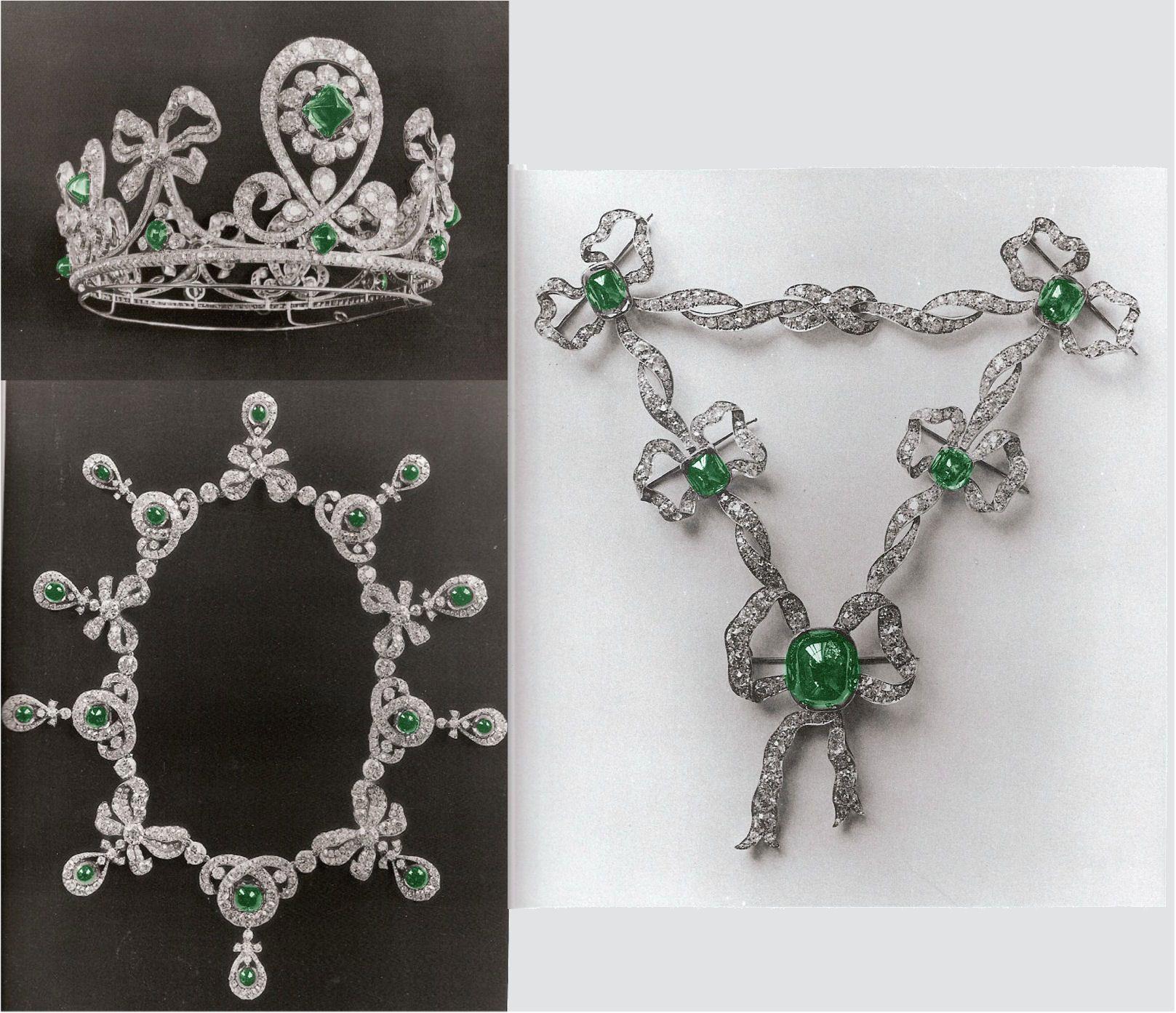 Изумрудная тиара последней Императрицы России Александры Фёдоровны. Диадема выполнена в стиле Рококо и состоит из чередующихся арок и бантов. Материалы: золото, серебро, южноафриканские бриллианты. Громадный травянисто-зелёный изумруд в центре диадемы весил 23 карата, но сей смарагд, найденный в копях Колумбии, для большего эффекта огранён высоким четырёхугольным пирамидальным кабошоном.