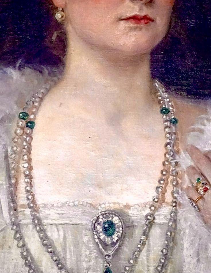 На портрете также изображены два жемчужных сотуара с изумрудами, которые не были частью парюры, но Императрица любила экспериментировать с украшениями.