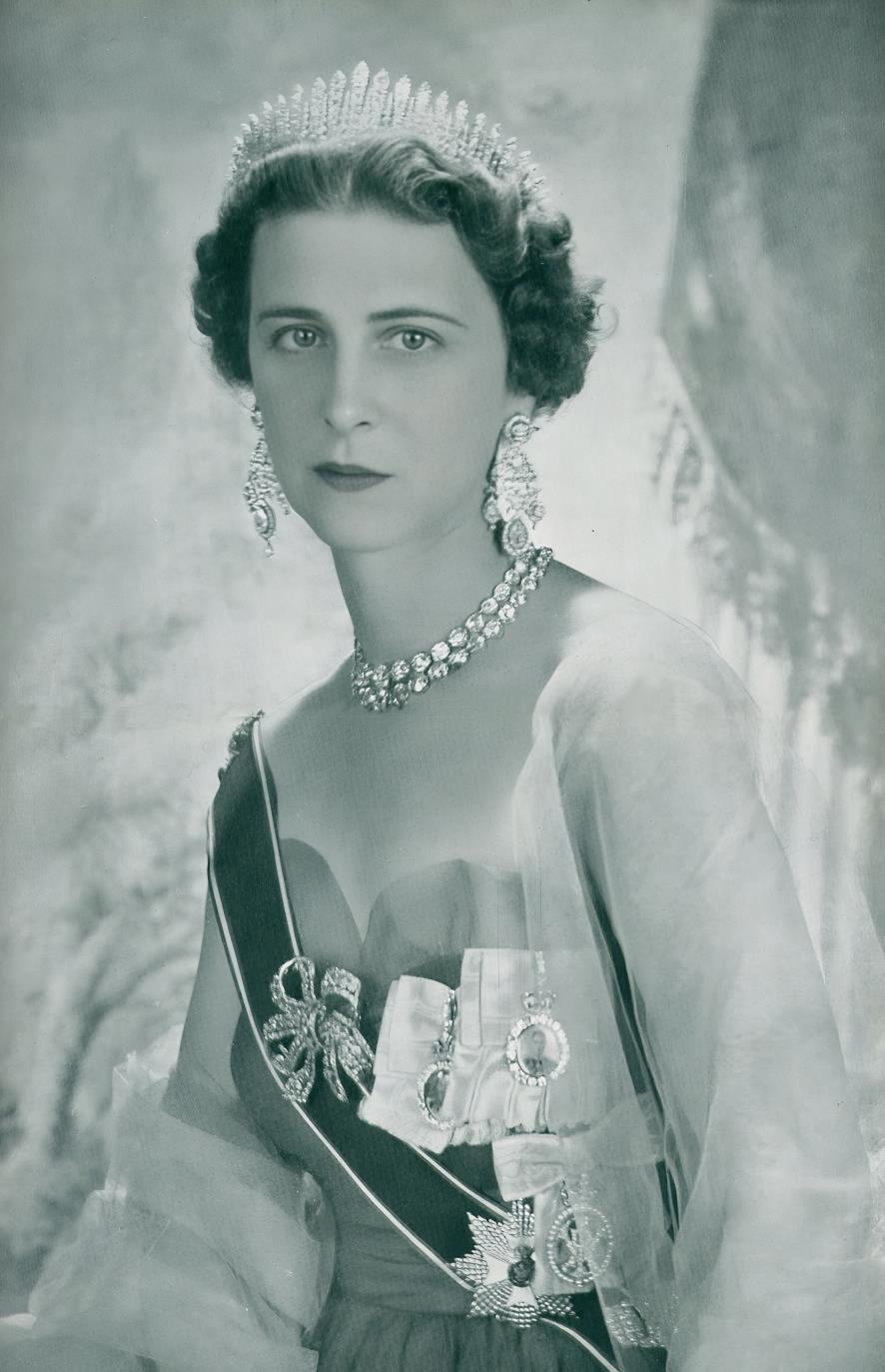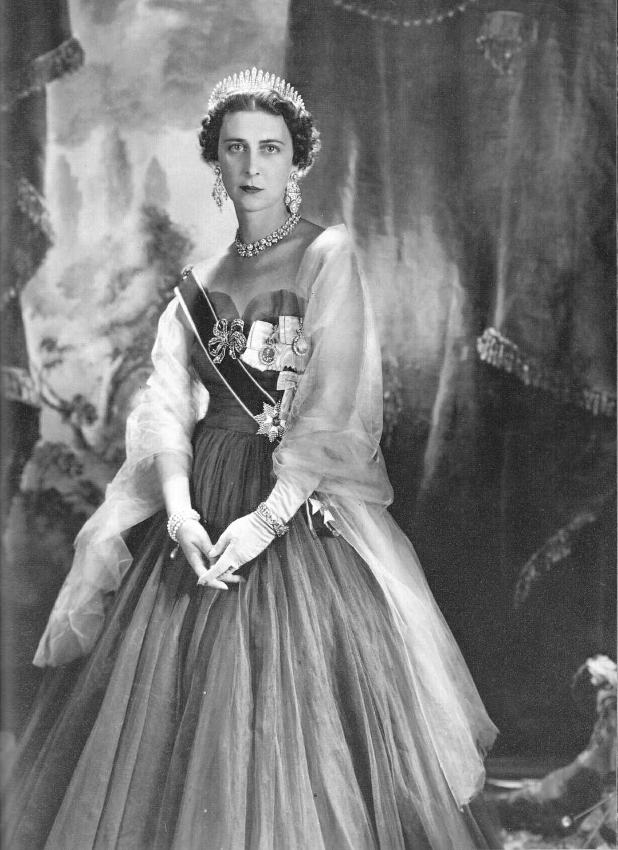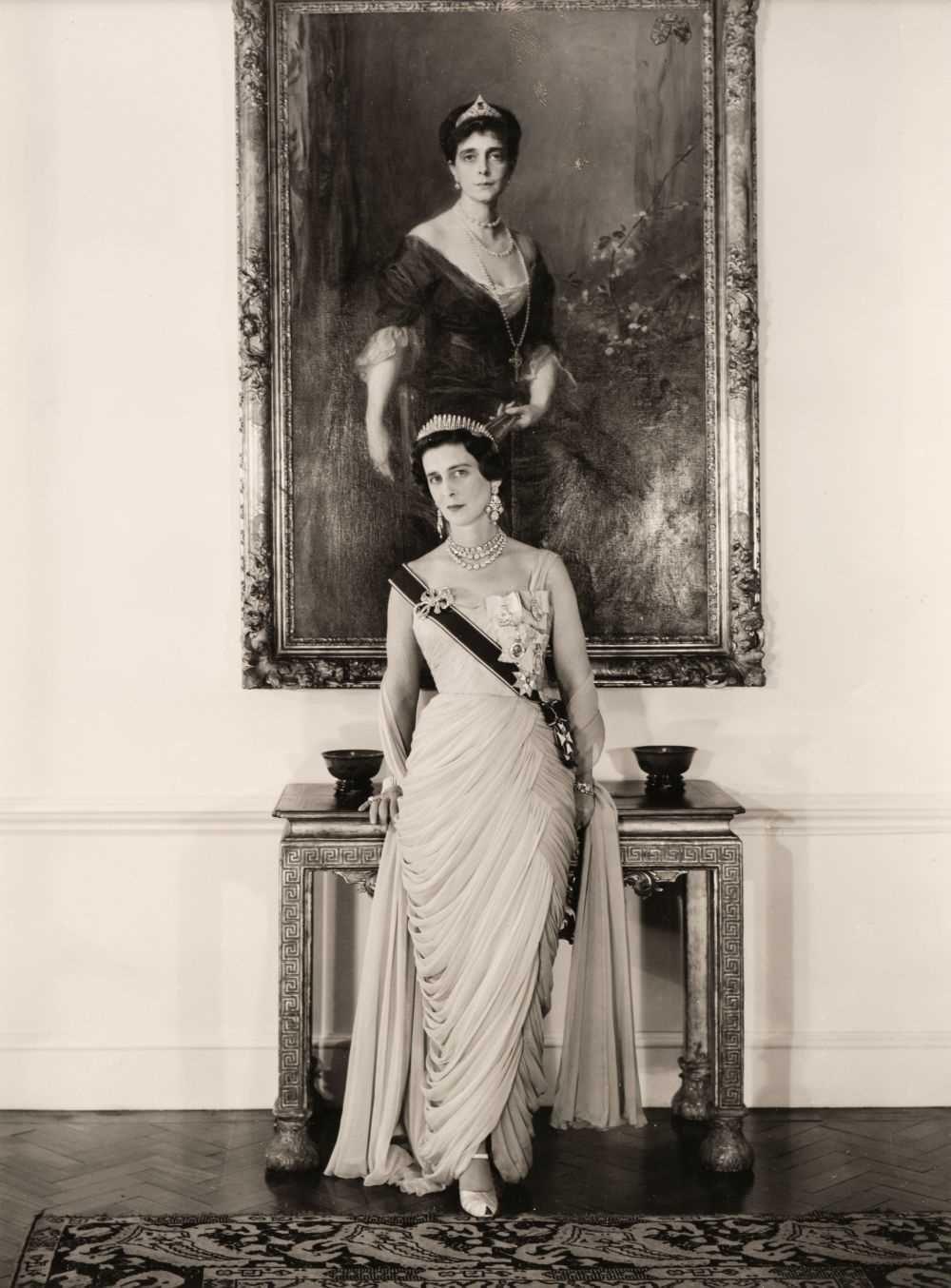Её Королевское Высочество принцесса Марина Греческая и Датская, герцогиня Кентская – в бальном платье, Кентской диадеме, с бриллиантовой брошью-бантом её бабушки, Марии Павловны, и драгоценностях: Королевский Викторианский Орден и Ордена Королевской семьи. Фотограф Сесил Битон. Октябрь 1952 года.