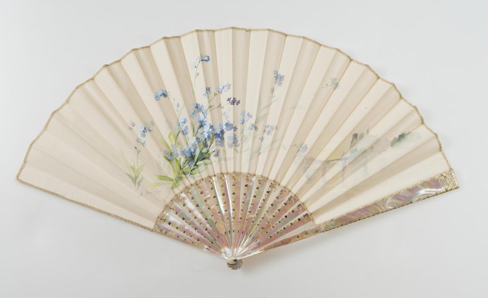 Веер складной с изображением незабудок. Создатель: Корнелиус, Мари-Люси (1850-1915) – художник. Фирма: «Rodien». Место создания: Франция, Париж. Время создания: 1890-е гг. Материал: перламутр, газ, гуашь. Длина 35,4 см. Государственный Эрмитаж. Санкт-Петербург.