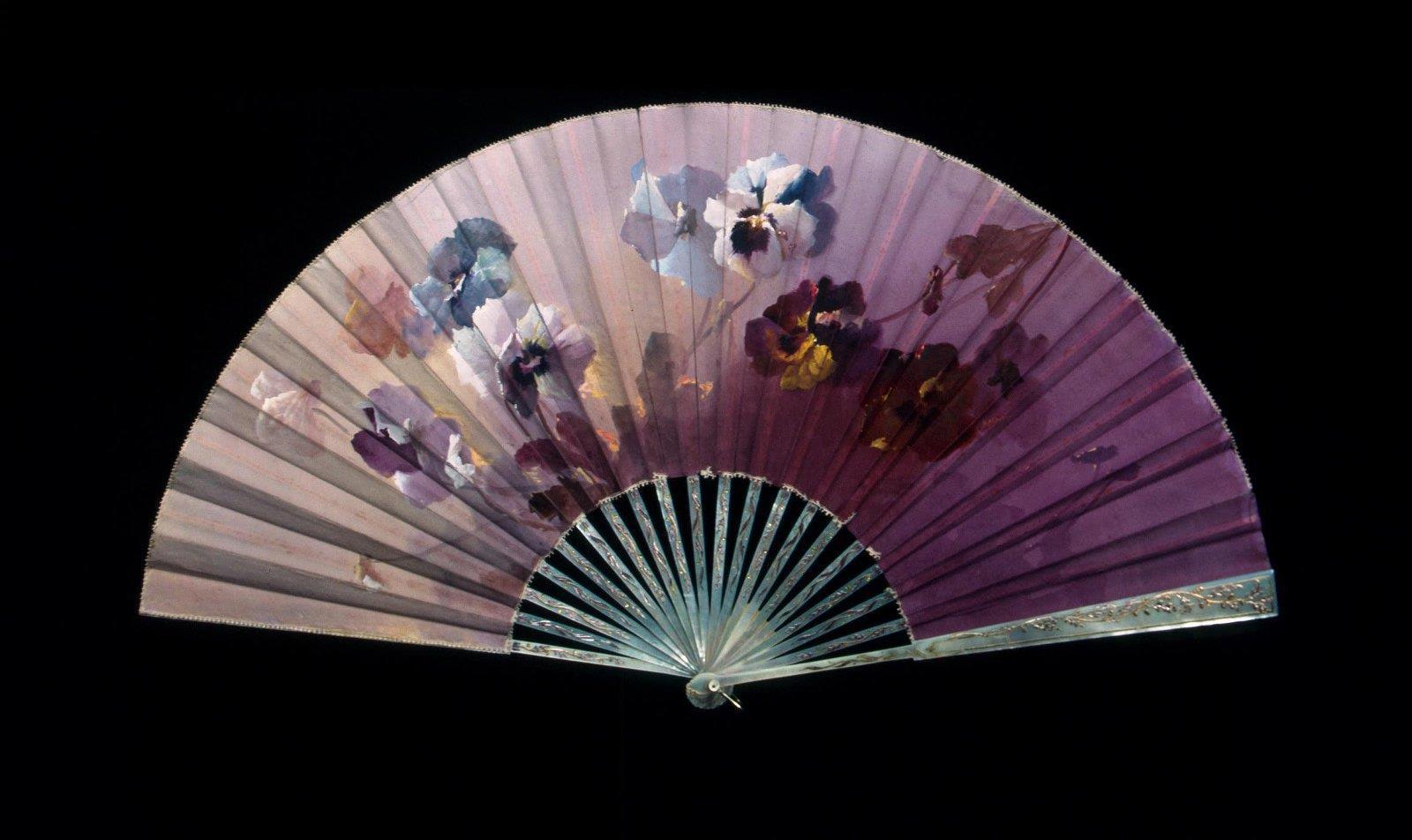 Веер складной с изображением анютиных глазок. Создатель: Альберти, Анри (1868-?) – художник. Место создания: Франция. Время создания: 1890-е гг. Материал: перламутр, гренадин, газ, гуашь. Длина 35,5 см. Государственный Эрмитаж. Санкт-Петербург.