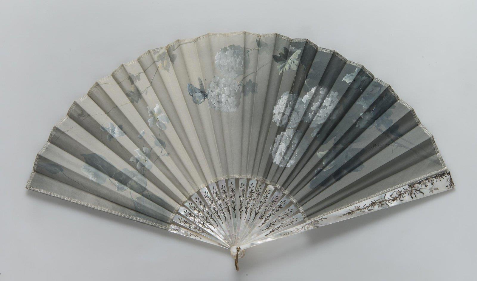 Веер складной с изображением фиалок и гортензий. Создатель: Биллоте, Луи-Леон-Эжен (1883-1940) — художник.Фирма: «Duvelleroy». Место создания:Франция. Время создания:1890-е гг.Материал:перламутр, фольга, газ, гуашь. Длина 35см. Государственный Эрмитаж. Санкт-Петербург.