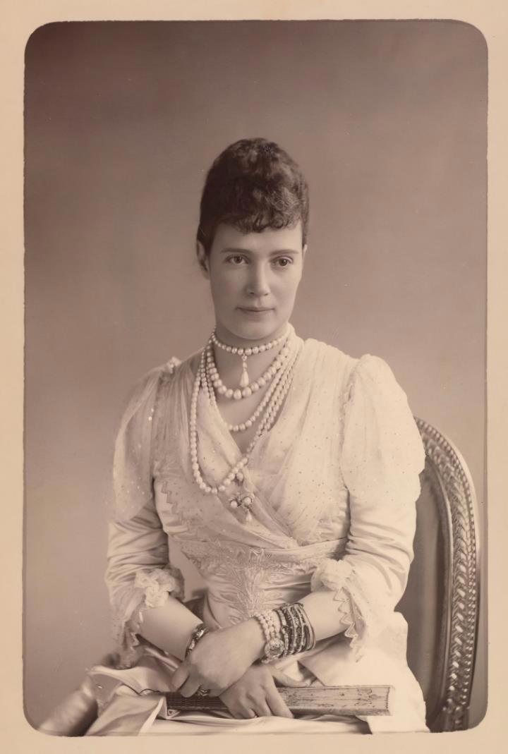 Императрица Мария Фёдоровна (при рождении Мария София Фредерика Дагмар): портрет в три четверти роста, сидит, в многорядном ожерелье, держит веер на коленях. 1892 г. Фотограф: граф Сергей Львович Левицкий (1819-1898) — он считается одним из патриархов русской фотографии и одним из важнейших европейских пионеров фотографии, изобретателей и новаторов .