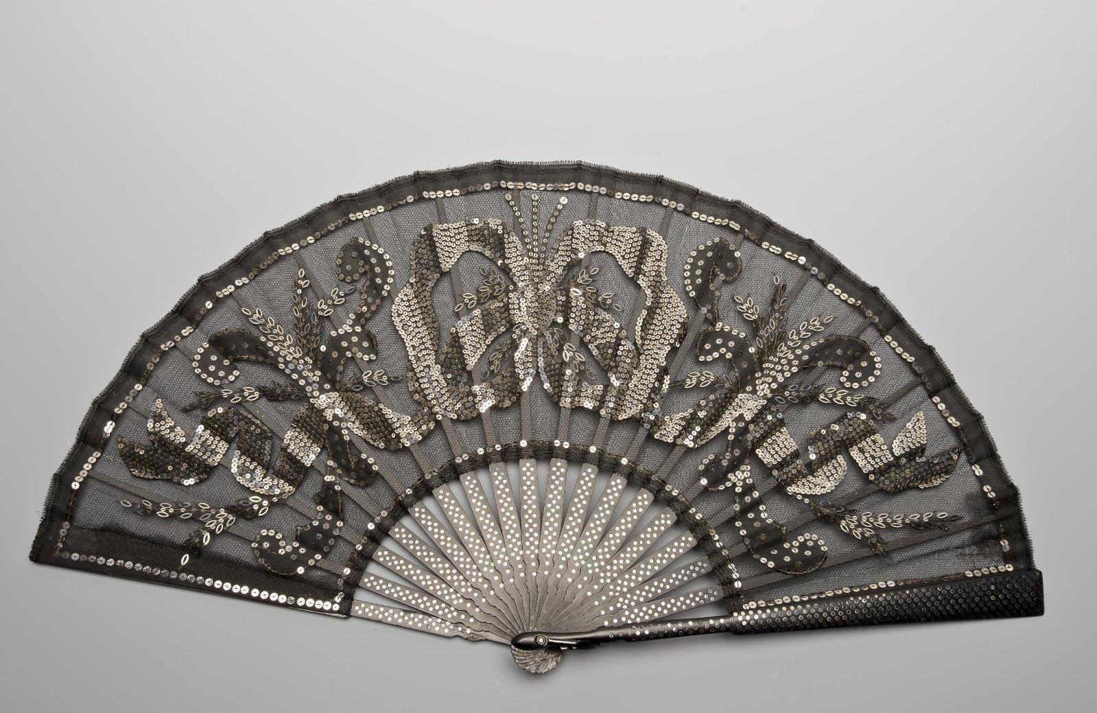 Фирма: «Александр». Веер складной из чёрного дерева, экран газовый, с узором в виде лент, завязанных бантами, выполненным из стальных блёсток. Место создания: Россия, Санкт-Петербург. Время создания: 1900-е гг. Материал: тюль, блёстки, дерево; вышивка. Длина 24,8 см. Государственный Эрмитаж. Санкт-Петербург.