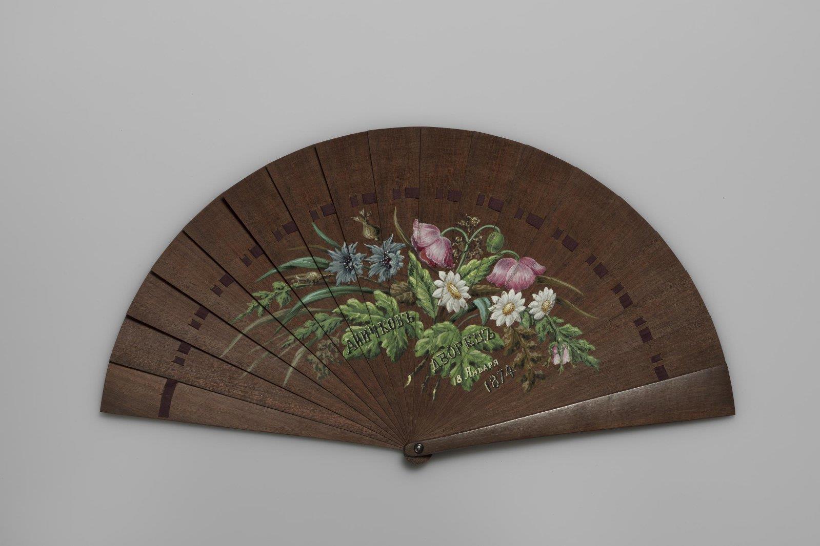Веер складной деревянный, с надписью: «Аничковъ дворецъ. 1874» Место создания: Россия. Время создания: 1874 г. Материал: дерево; роспись (масло). Длина 20,5 см.