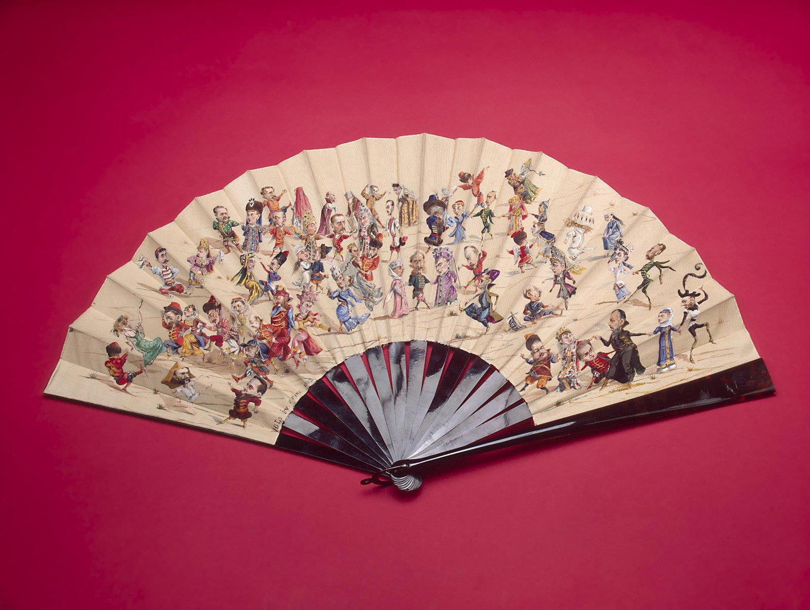 Веер складной с карикатурным изображением костюмированного бала 25 января 1883 г. во дворце великого князя Владимира Александровича. Создатель: Всеволожский, Иван Александрович (1835-1909). Место создания: Россия. Время создания: 1883 г. Материал: черепаха, шёлковый репс, гуашь. Длина 37,5 см. Государственный Эрмитаж. Санкт-Петербург.