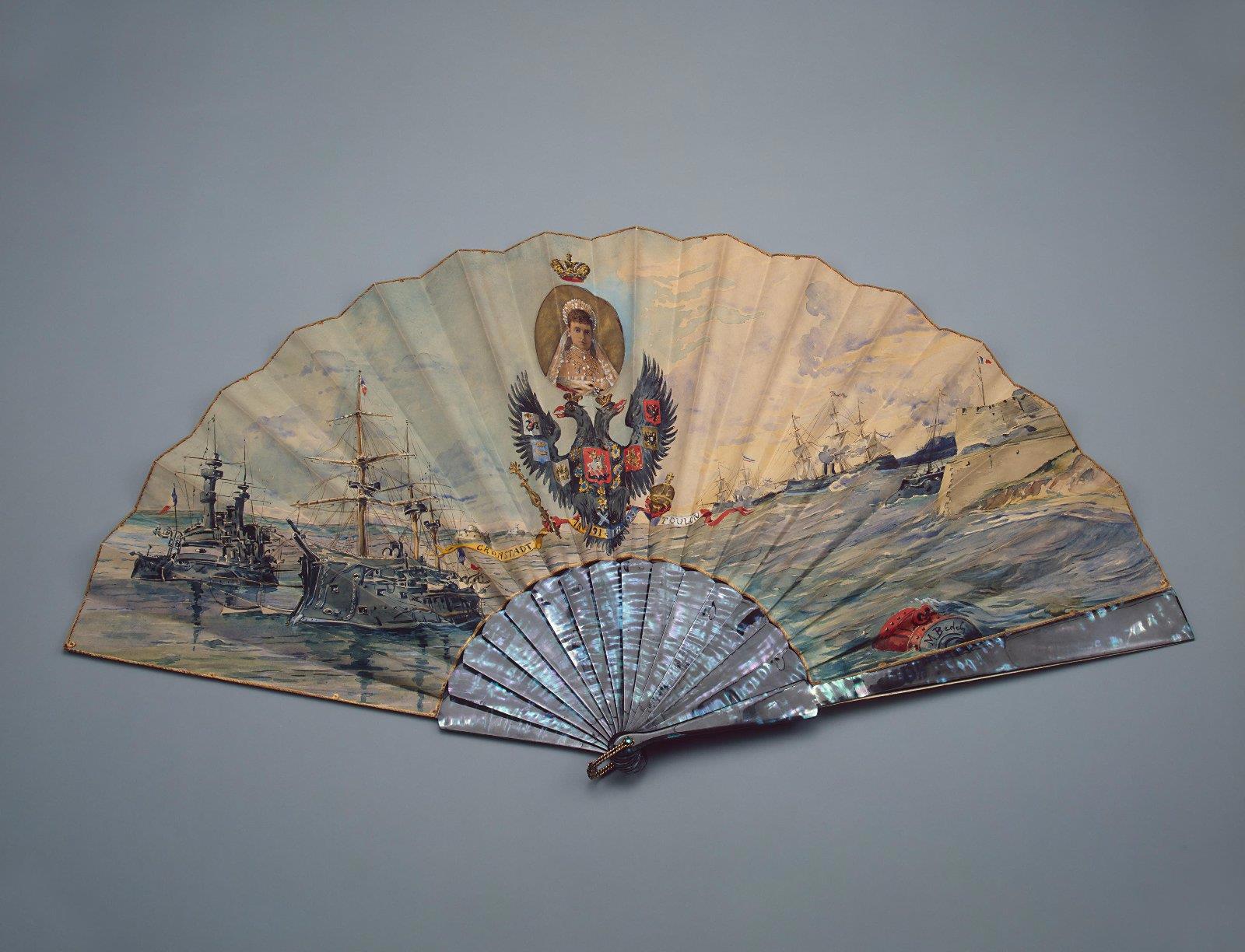 Фирма: «Duvelleroy». Место создания: Франция, Париж. Время создания: 1893 г. Материал: перламутр, пергамент, гуашь, серебро. Длина 35,3 см. Государственный Эрмитаж. Санкт-Петербург.