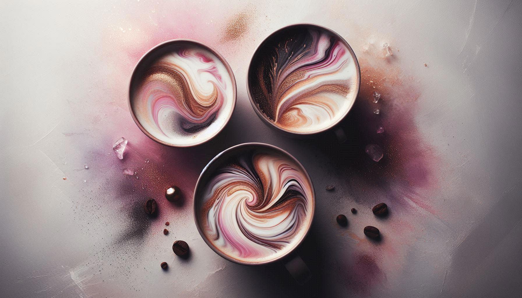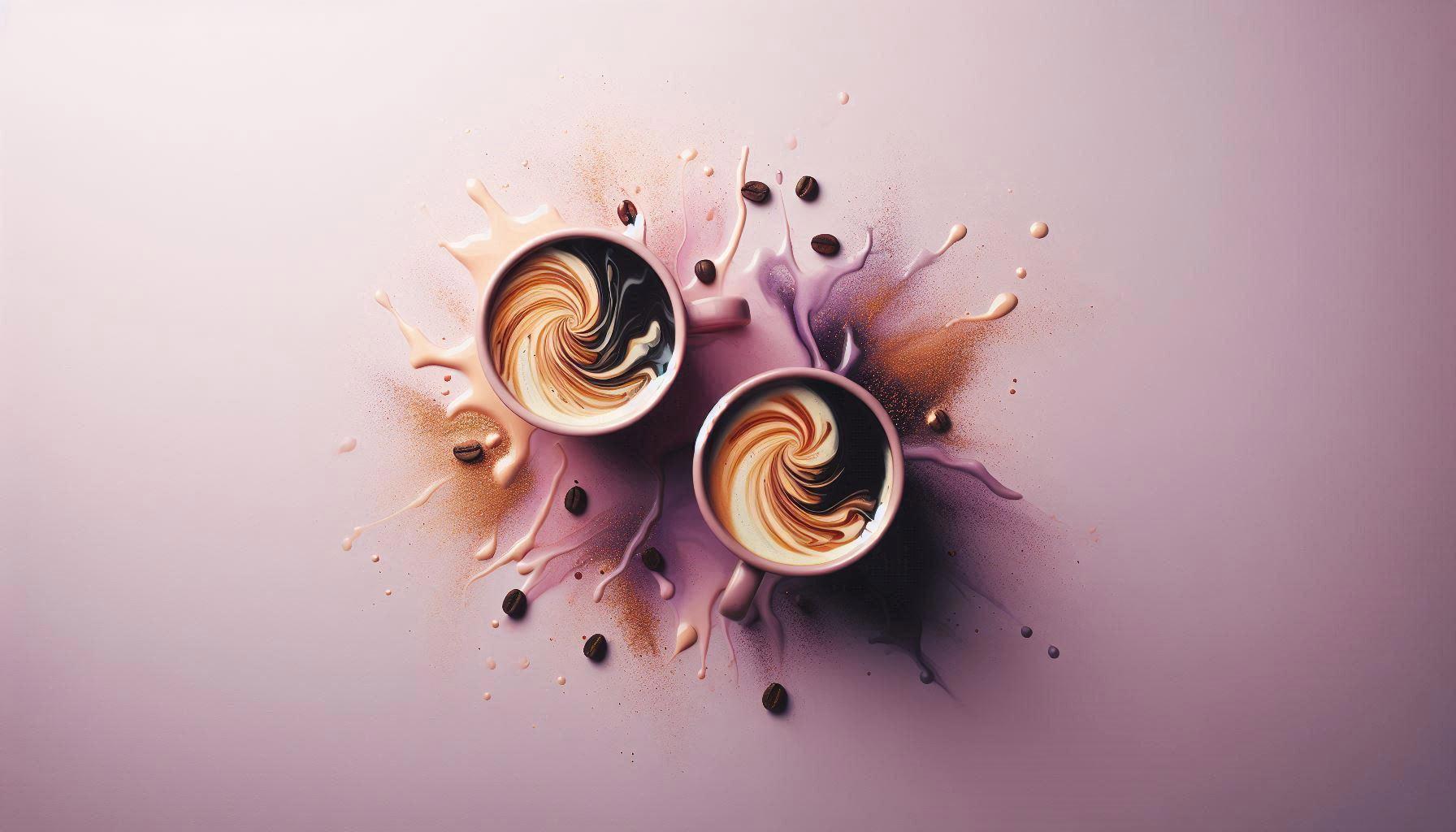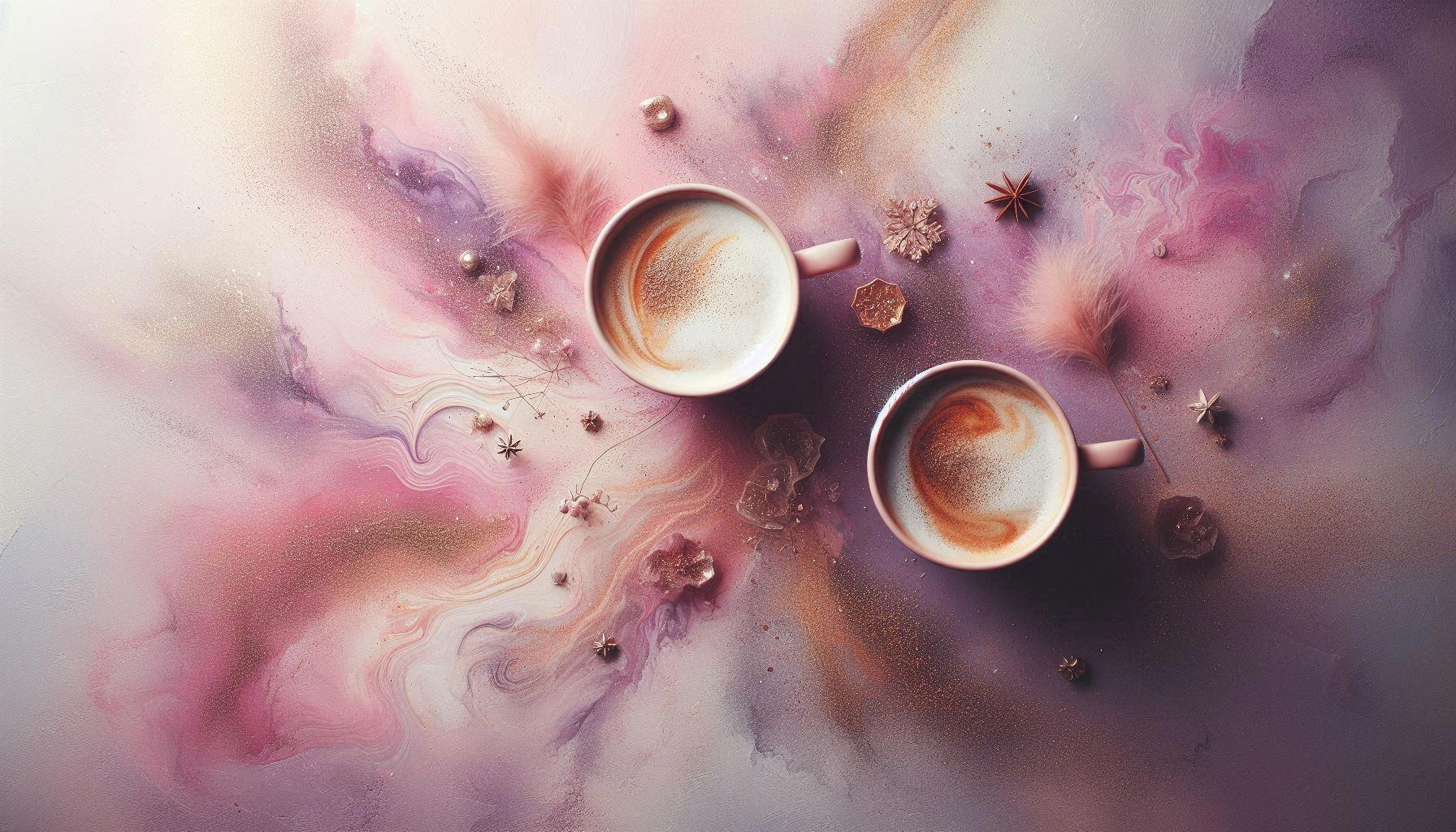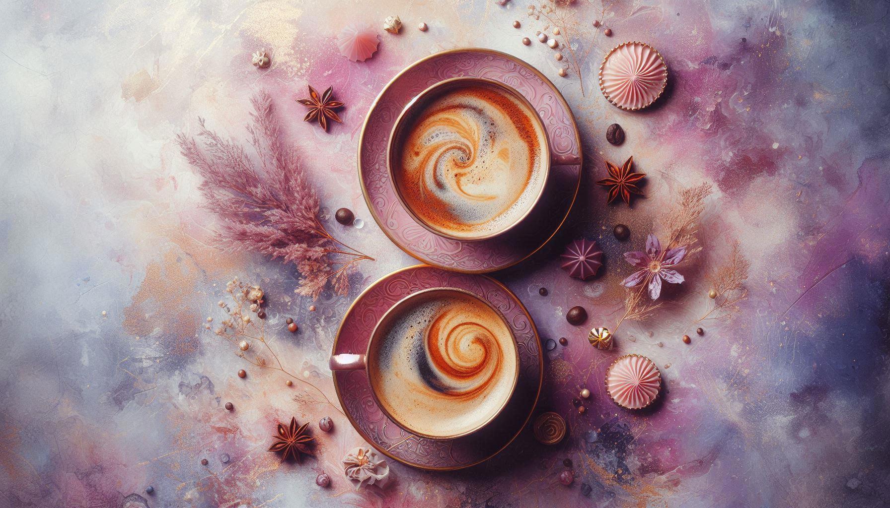 two cups of coffee with streaks of coffee foam. Top view. Soft color palette with very tender mystical shades (dark pink, light purple, a little gold). soft pastel purple background