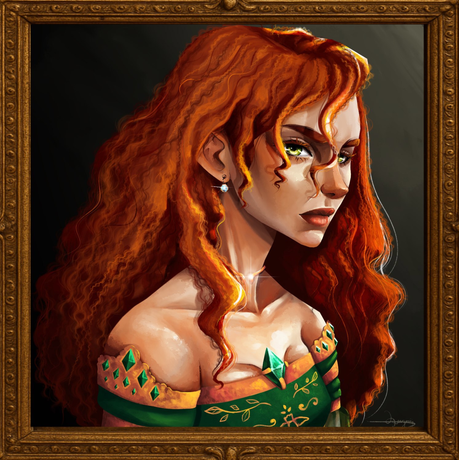 На портрете изображена Элли, принцесса королевства Кортленд - главная героиня истории. Её узнают по рыжим, словно огонь, кудрям, проницательному взгляду и зелёным глазам, в которых легко прочитать решимость и внутренний огонь. Элли воспитана, умна и наблюдательна, однако в её характере уже давно назревает бунт.