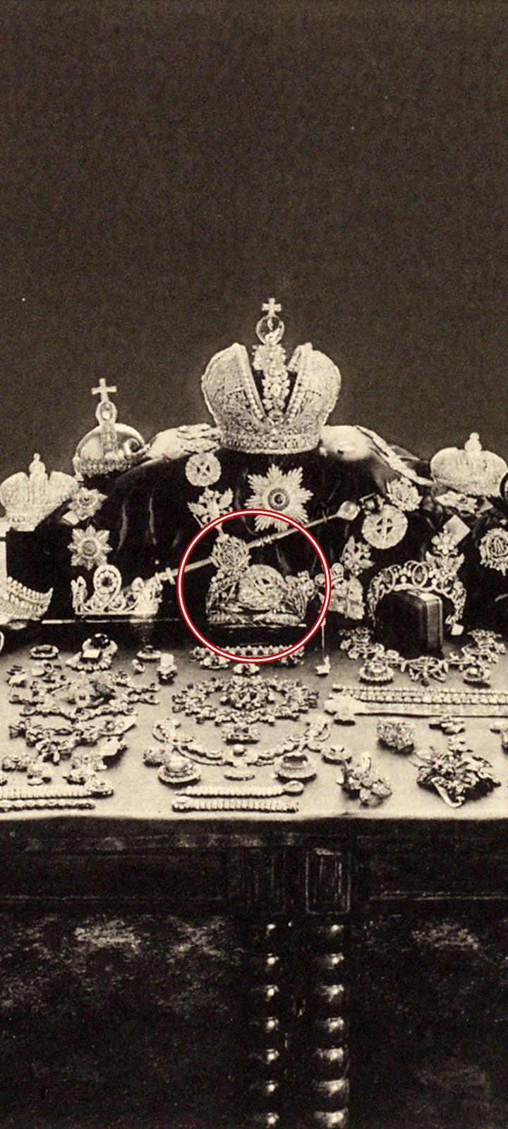 Знаменитое фото основной части российских коронных драгоценностей и драгоценностей Императриц, сделанное советской комиссией в 1922 г. На столе представлены 13 диадем + 4 короны, диадема-бандо с пчёлками, скипетр, держава и другие ценности, привезённые в Московский Кремль.