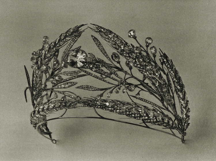 Похожую тиару из лавровых листьев носила Императрица Елизавета Алексеевна, невестка Марии Фёдоровны. Вероятно, она входила в состав сапфирового гарнитура, исполненного для супруги Александра I братьями Яковом и Франсуа Дюваль.