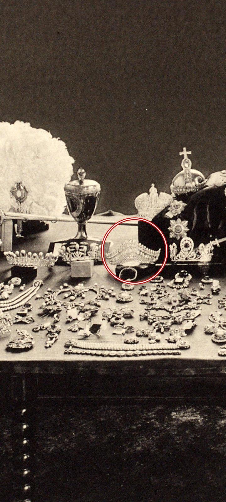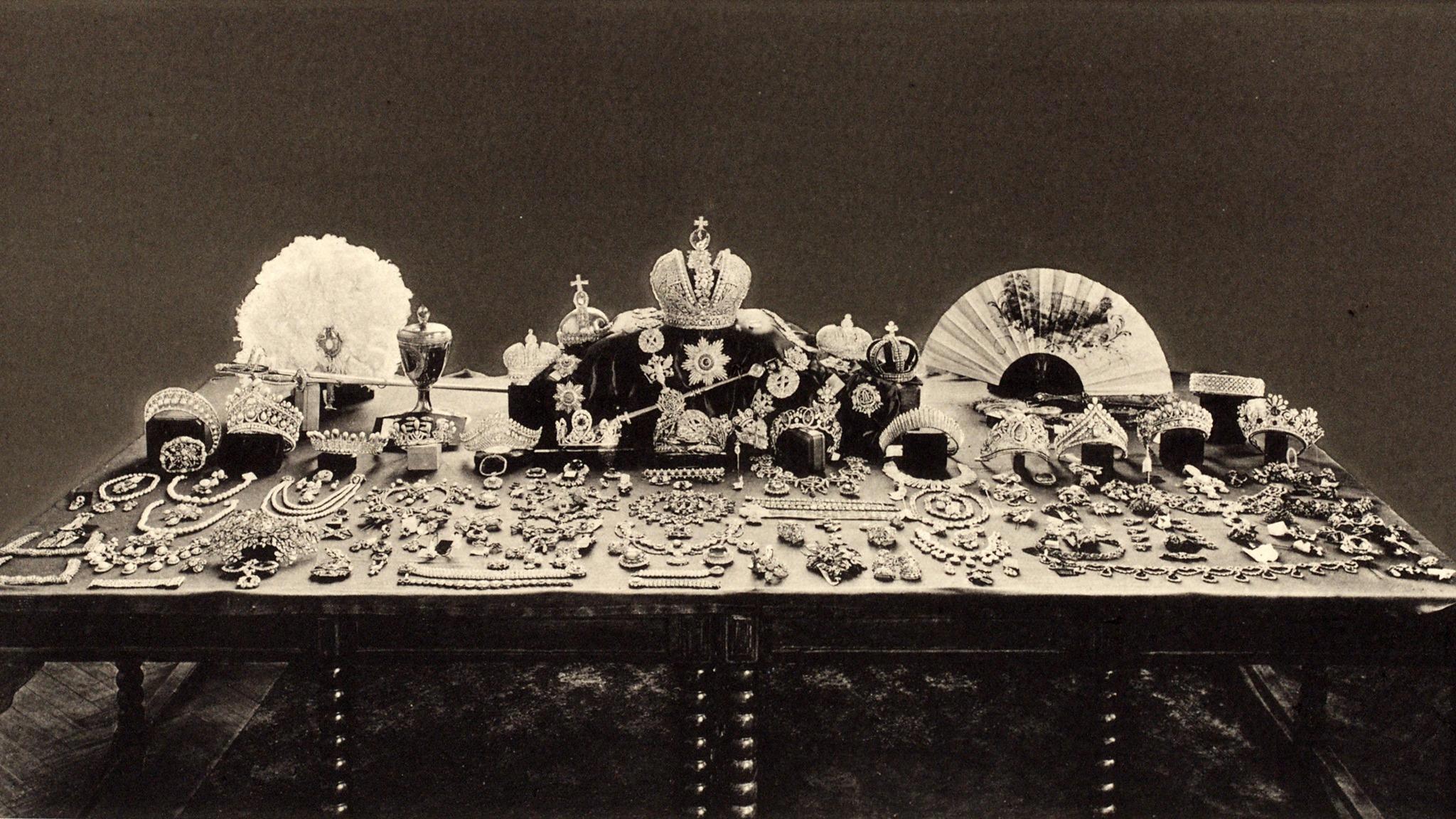 Знаменитое фото основной части российских коронных драгоценностей и драгоценностей Императриц, сделанное советской комиссией в 1922 г. На столе представлены 13 диадем + 4 короны, диадема-бандо с пчёлками, скипетр, держава и другие ценности, привезённые в Московский Кремль.