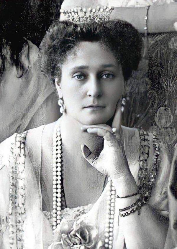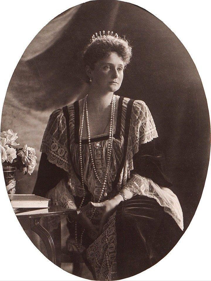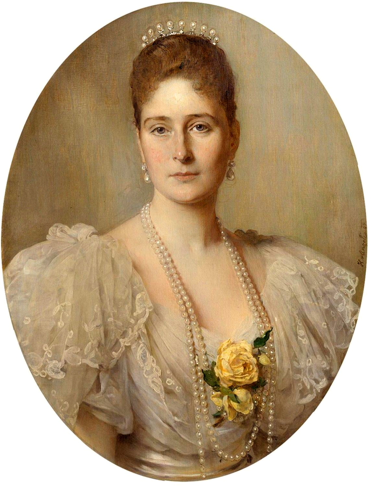 Впервые Александра Фёдоровна была запечатлена в жемчужной короне на портрете фон Ангели, который Императрица выслала в подарок бабушке, королеве Виктории.