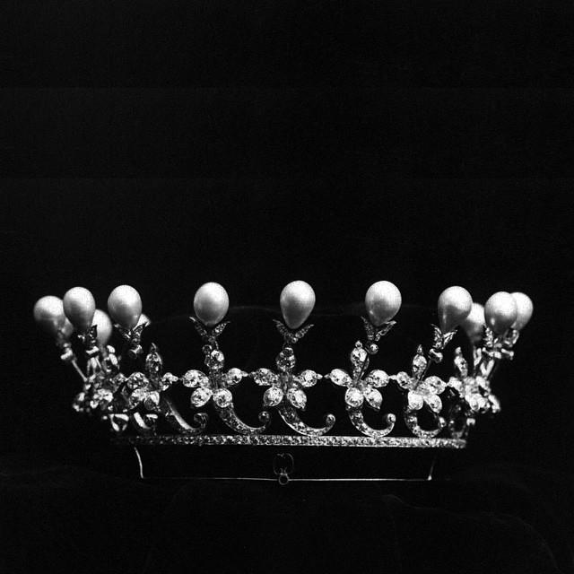 Крошечная корона состоит из 497 бриллиантов, оправленных в алмазный цветочный и завитковый узор, увенчанный 18 каплевидными жемчужинами.