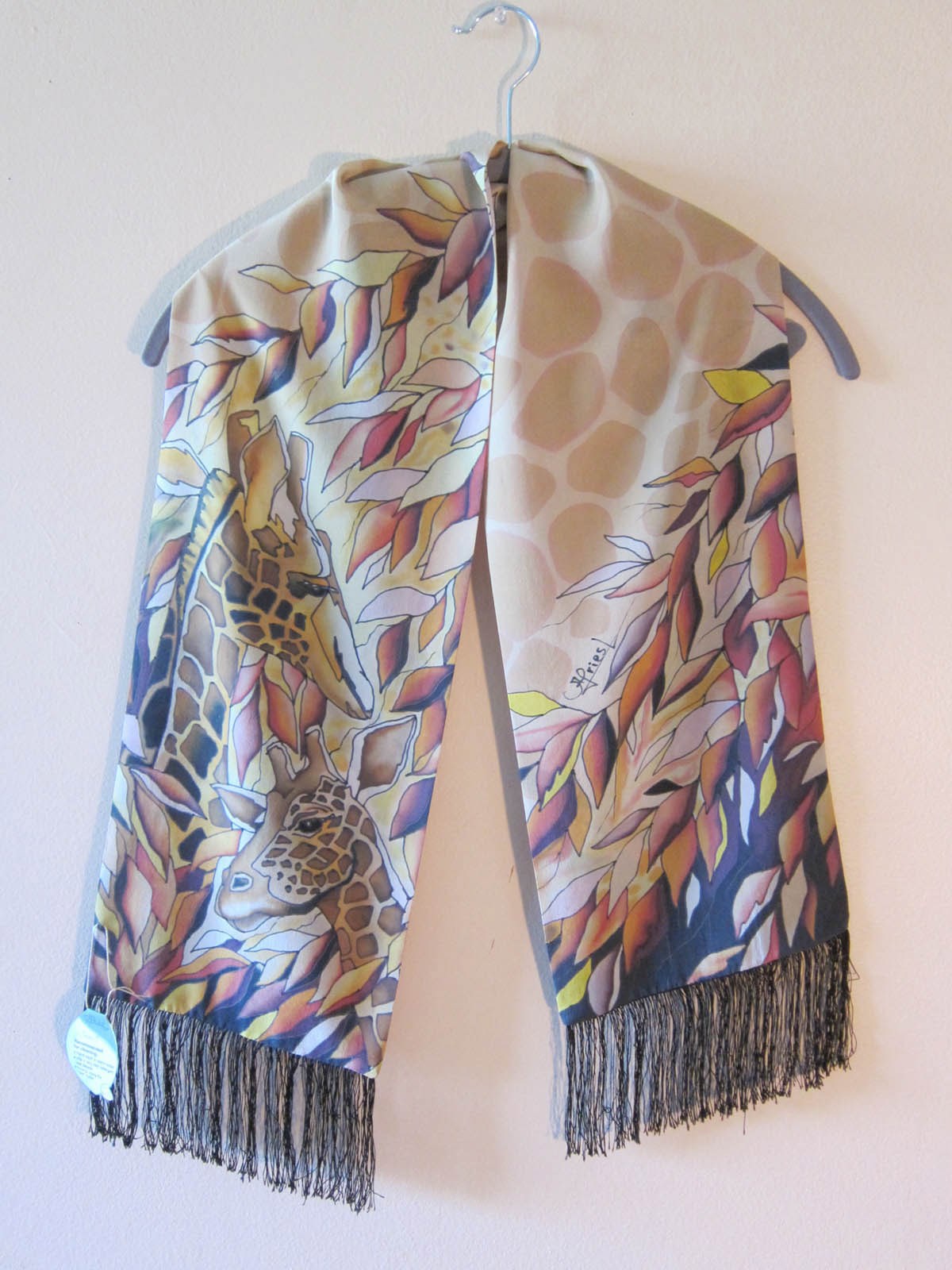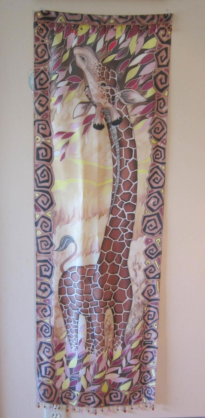 Была в моем батике жирафовая тема. Картина не получилась, поскольку жирафы в рамочный формат не помещались, поэтому рисовала шарфики -- в них лучше вписывалась длинная жирафовая шея