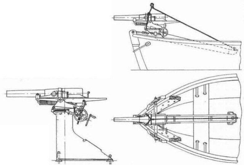 Станок на корабле устанавливался на специальной тумбе, прикреплённой тремя болтами к палубе (в виде равностороннего треугольника), высота оси цапф от палубы 1068 мм. Чтобы переставить качающуюся часть пушки с корабельной тумбы на колесный десантный лафет, требовалось отвинтить всего один болт. Высота оси цапф на колёсном лафете 864 мм. На шлюпках пушка устанавливалась на колесном лафете, при этом колеса снимались, а концы оси лафета помещались в железных подцапфенниках в планшире шлюпки и прикрывались железными горбылями. Задний конец хобота лафета прихватывался к банке канатом. Таким образом, орудие могло вести огонь со шлюпки в небольшом носовом секторе.