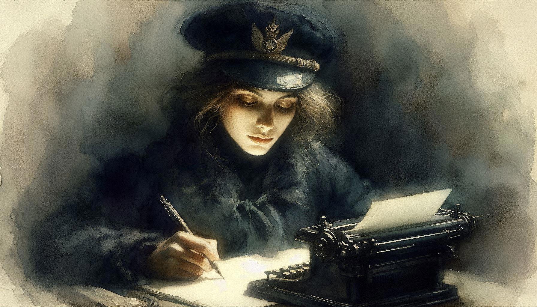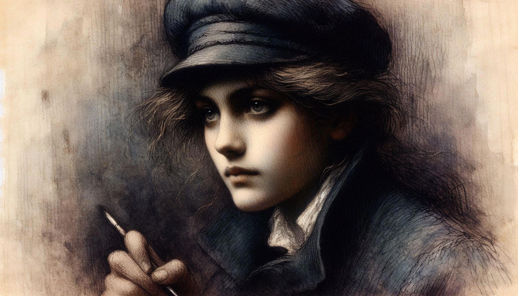 a twenty-year-old woman writer in a naval cap, watercolor painting, somber and tenebrous, rough texture, аrt by Gustave Moreau, Francisco Goya and Pre-Raphaelites