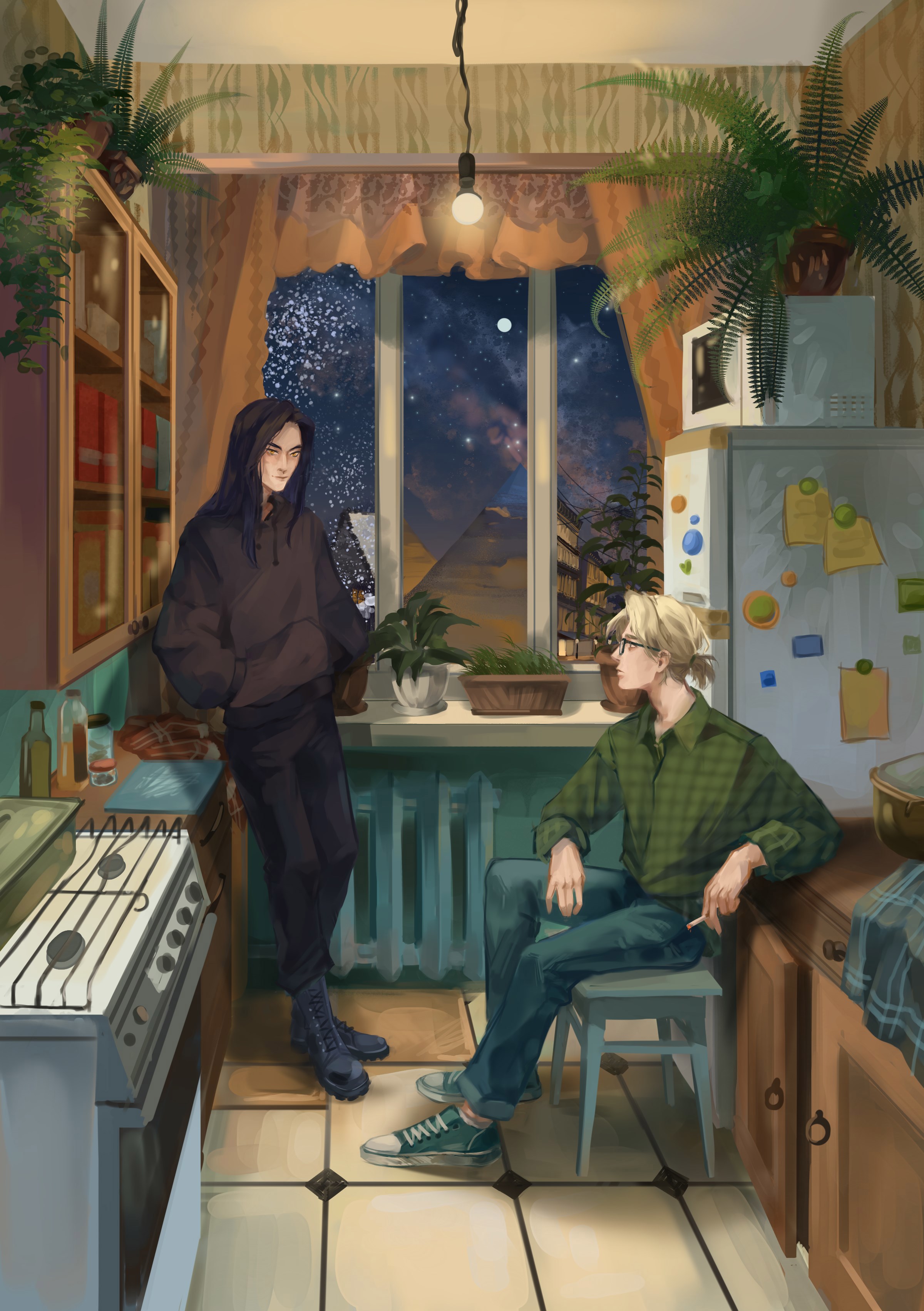 Олег и Сет на кухне Автор: Саша Солонгой иллюстрация от художницы Гамаюн арт, персонажи, мои персонажи, иллюстрация 42 Пожаловаться