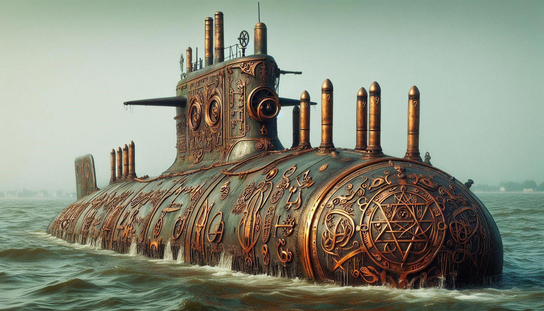 стимпанк подлодка "Мираж", покрытая защитными магическим символами от демонов