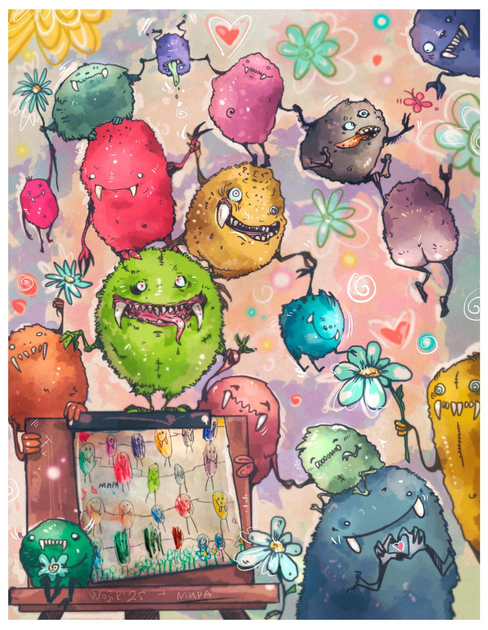 Рисую я монстров разных, и как-то показываю племяшкам, дескать, посмотрите, не страшно ли. А они мне: "Тетя Оля, не страшно! Мы тебе сейчас сами нарисуем!". Ну вот Мира нарисовала, а я думаю - какие ж они классные и я таких хочу. И нарисовала ее монстров как вижу. Вот такой получился натюрморд =)