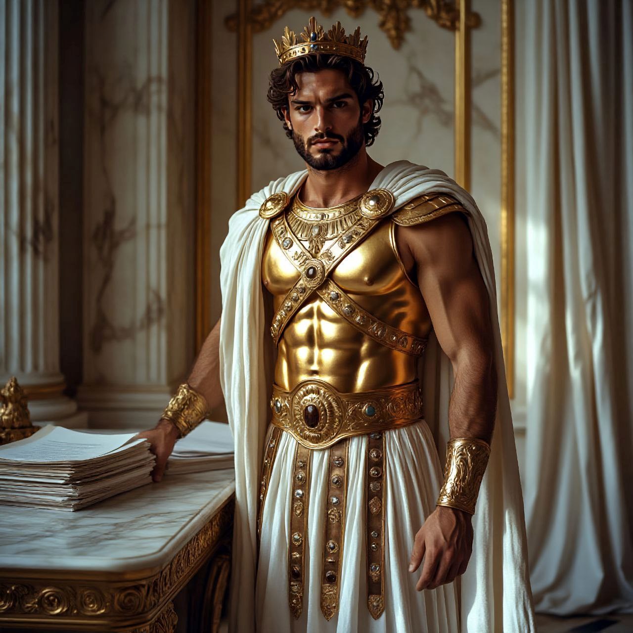Владыка Небесных гор. Глава небесного дома Огненных Львов, отец наследного принца Леголиона Леона де Гораднского. Близкий друг Мизуро Райто из небесного дома Светоносных Лисиц. (изображение создано с помощью искусственного интеллекта)