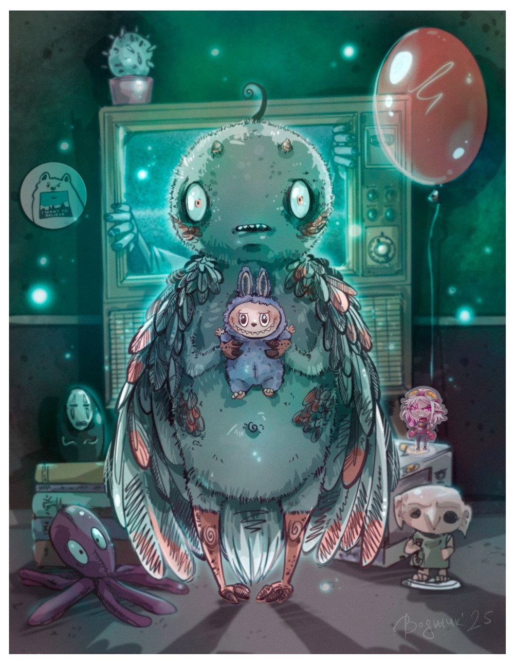 Весной одна моя замечательная читательница подарила мне лабубу. И раз этот зверь часто маячил на столе, то просто наглым образом влез в картинку. Мутантская моль и его трофеи. Где-то среди миров и историй.