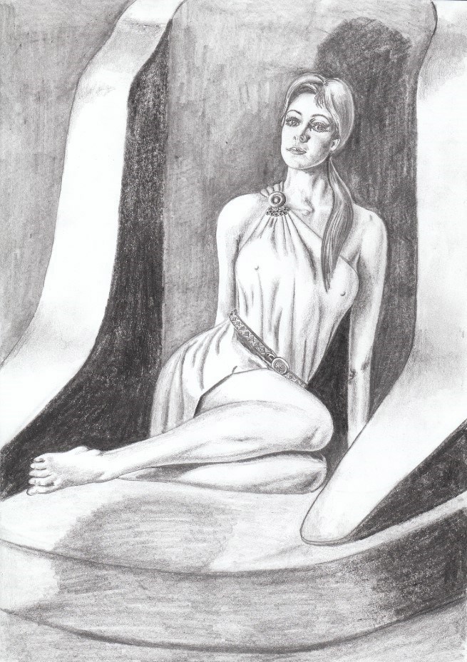 Изначально, когда ещё не было нейронок и авторам приходилось создавать образы своих героев самим, как умеют, либо обращаться к иллюстраторам, предполагалось, что Ратьяна в зале Храма после выпадения из Трона-ежа выглядит вот так.