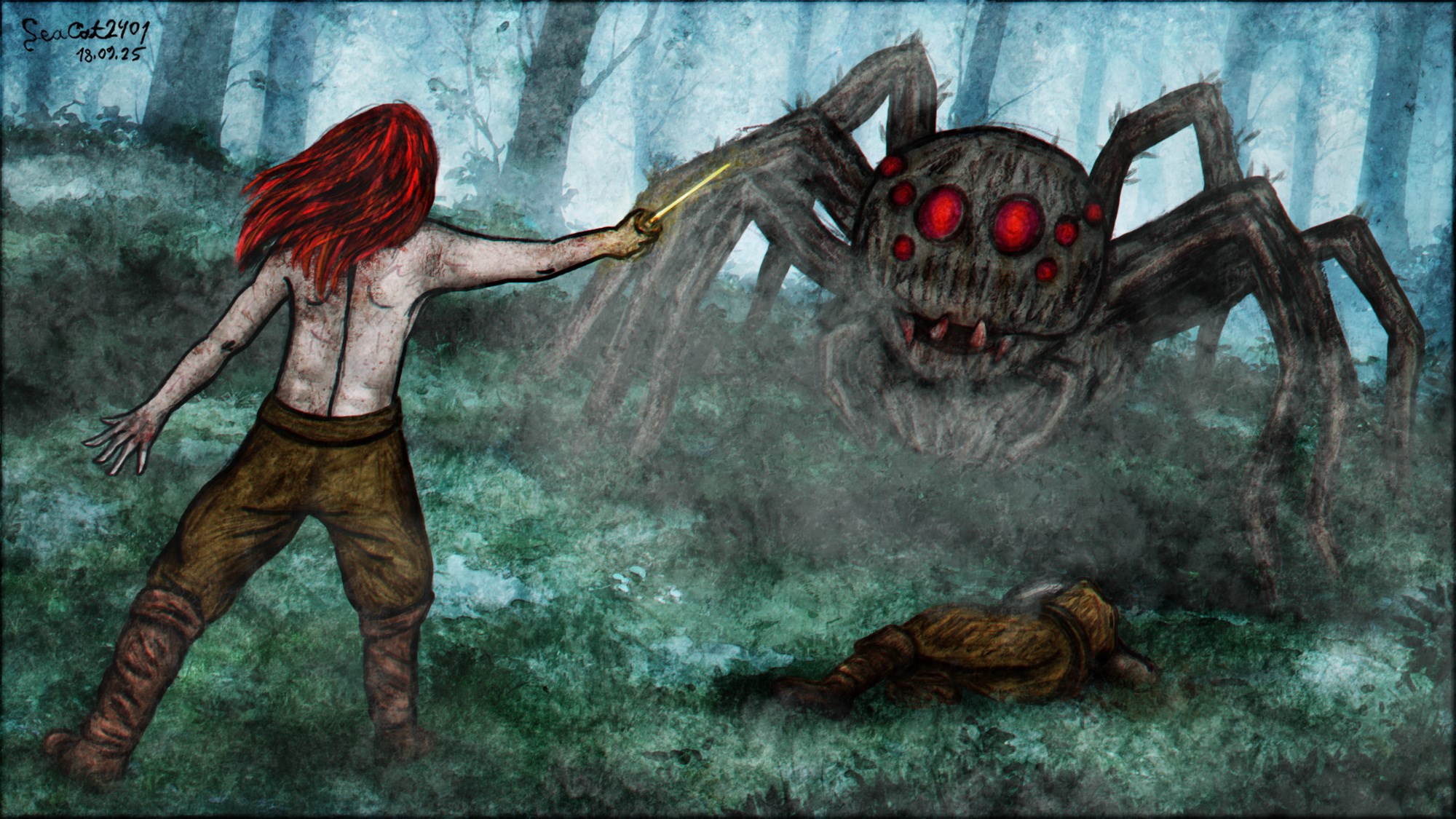 Это, на самом деле, были паучьи лапки. Гигантские! Существо явило себя, осознав, что нет смысла прятаться. Огромный паук в два человеческих роста, чьи глаза пестрели алыми бусинами, заревел, показывая острые зубы...