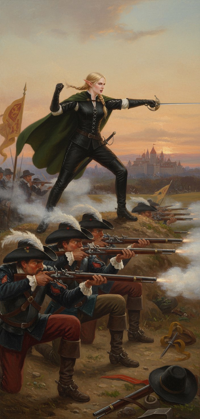 Мушкетёры Чёрной Гвардии ведут огонь с недостроенных редутов под руководством леди-капитана Литэль в ходе битвы под Дертом. Рисунок от ИИ.
