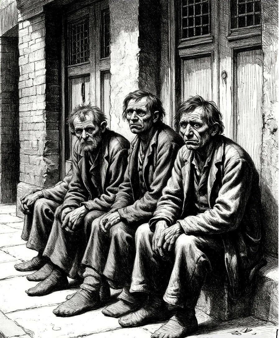 Арестованные бродяги в муниципальной тюрьме. Чтобы заключённые не убежали администрация тюрьмы отобрала у них башмаки. Взамен выдали дешёвые бумажные (в 19 веке так называли хлопчатобумажные) носки. Гравюра 19 века. Работа Sheda Vruma
