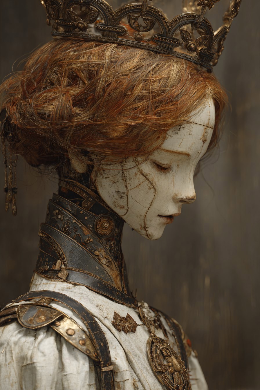 gently detailed Edwardian style full-sized doll in the form of a young queen, with a golden crown on her head. A white face with a slightly sad, smiling smile. A porcelain body. Bronze joints. She wears a white royal dress from early 20th century. The lighting is soft, diffused, emphasizing the form. Art by Eve Ventrue, realistic fantasy painting --chaos 10 --ar 2:3 --profile iomhvnn --stylize 200