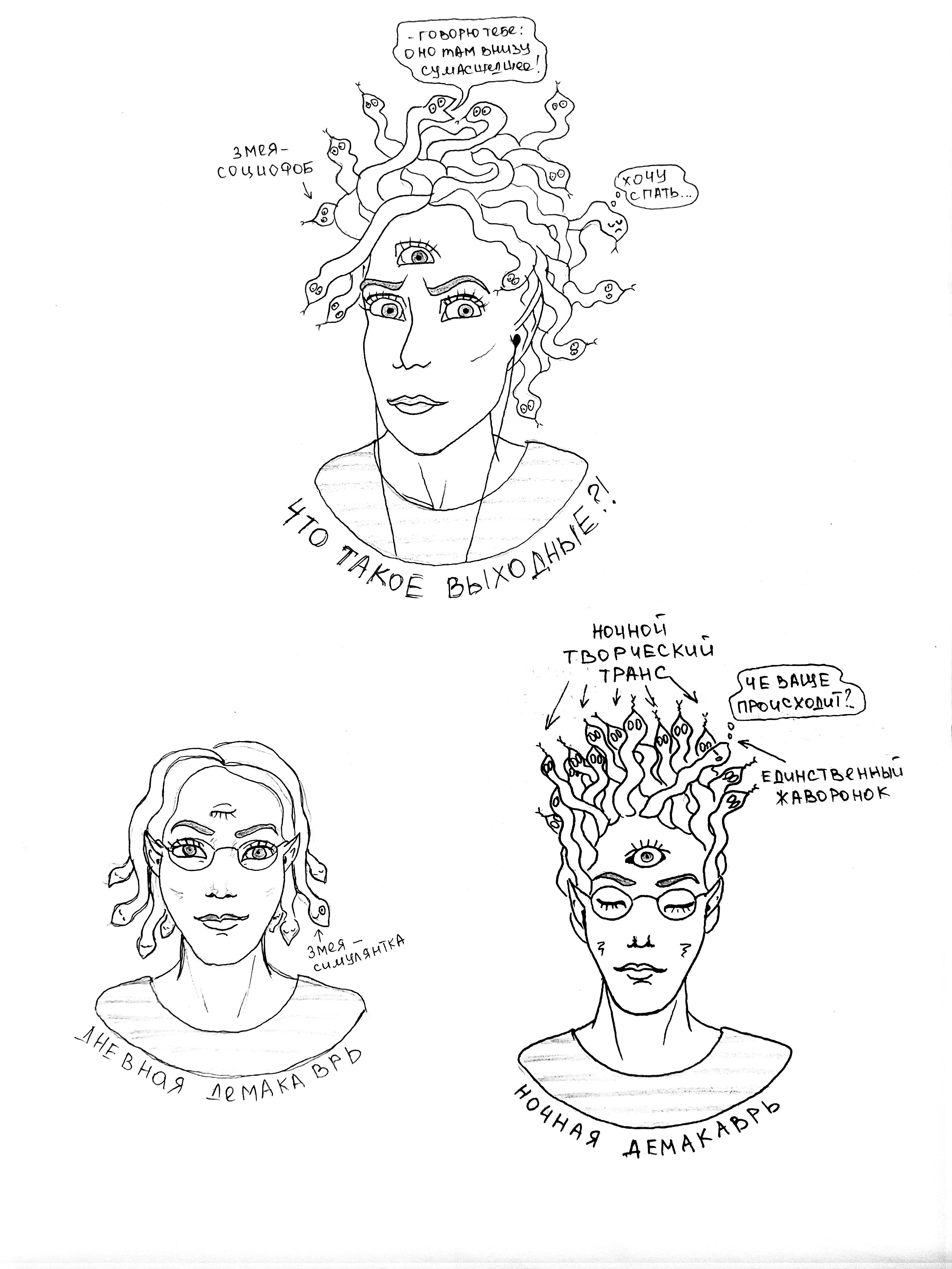 Автопортрет-триплет Автор: Demacawr Верхний рисунок нарисовался ещё в 2019 году.Нижний правый (ночная Демакаврь) образовался только что автопортрет, авторский арт 10 Пожаловаться