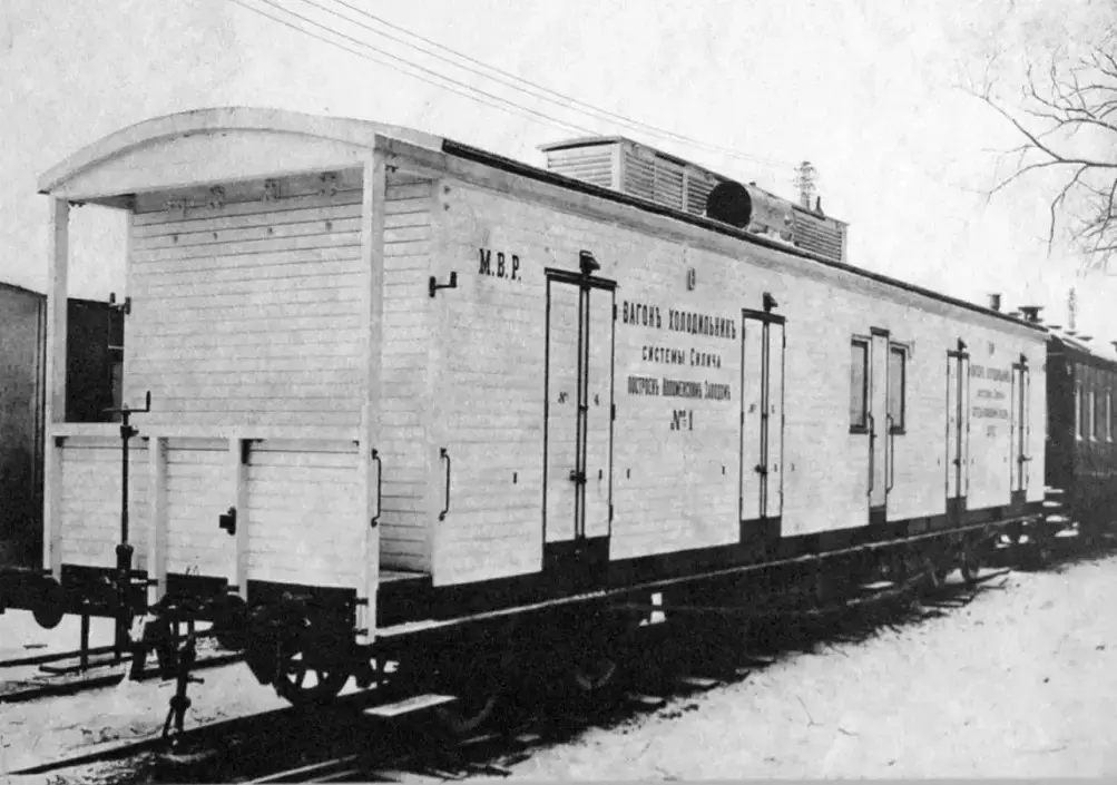 Первый вагон с механическим охлаждением – рефрижератор системы Силича был построен на Коломенском заводе в 1910 году. Внутри вагона находилось отделение для обслуживающего персонала, холодильная установка и камеры для перевозимого груза, в которых могла поддерживаться необходимая температура. Грузоподъемность его составляла 11 т.