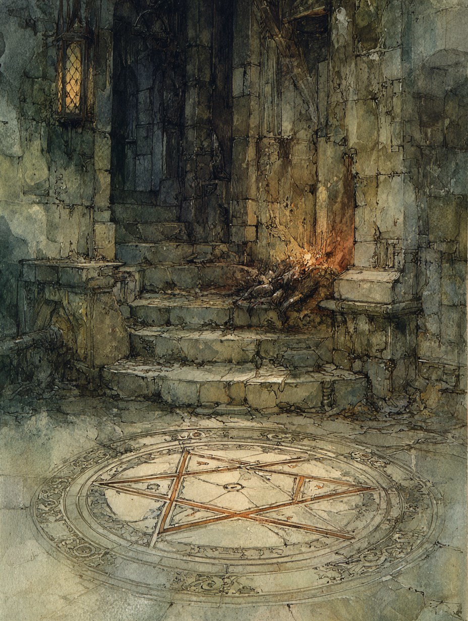 ... fiery pentagram on the floor of the castle's stone dungeon. The demon's paw extends beyond the pentagram.