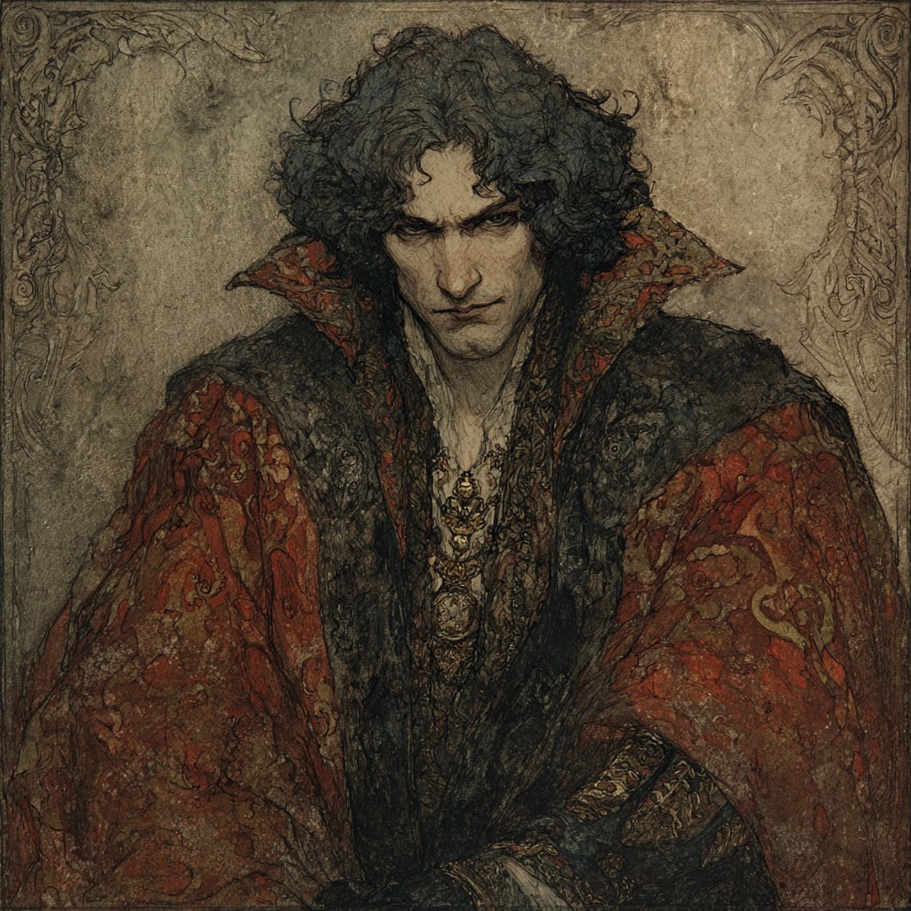 supreme vampire A smart look. Dark curly hair to the shoulders. clothing of a nobleman of the 15th century.