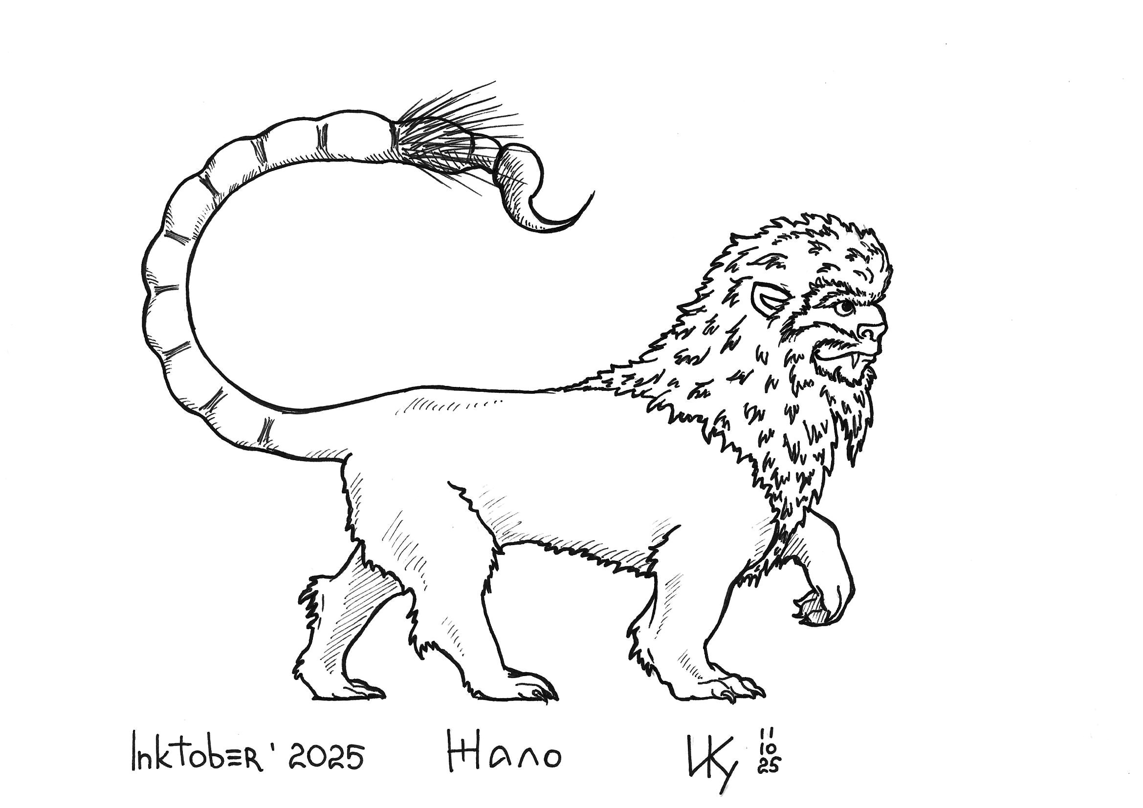 Красавец-мущщина мантикора с ликом бибизьяны-бабуина, весь в бородах, клыках, когтях, телесами тучен, нравом дик, а как март настаёт, так у него гон - ревёт на всю округу благим матом, что вызывает стихийныя бедствия в виде оползновения камней в горах и ипохондрии.