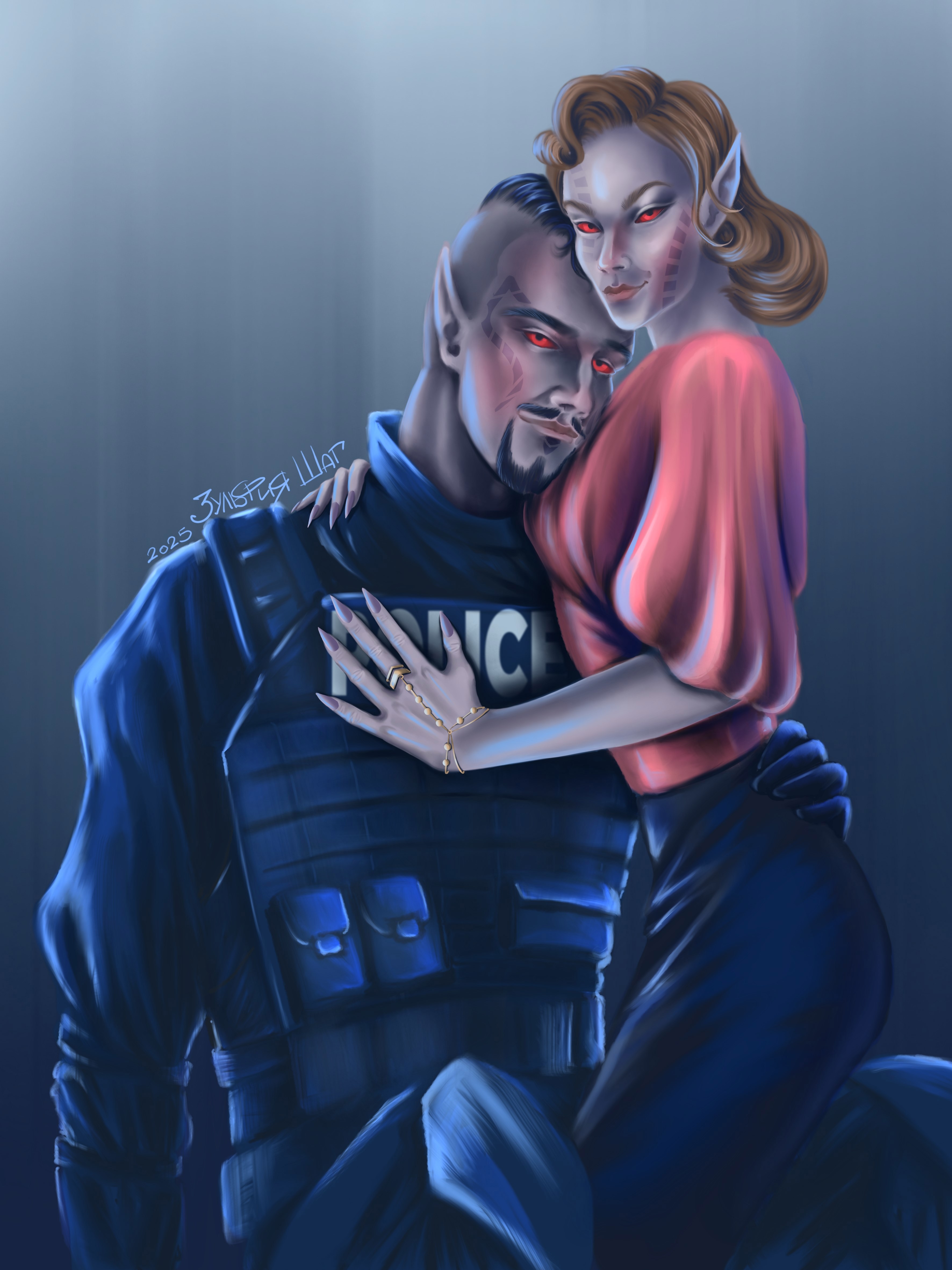 Рисунок в AU тематике для победительницы лотереи в группе вк, Ву – её персонаж из мира Свитков. Телдрин – полицейский из группы захвата, а Ву – королева Мафии.