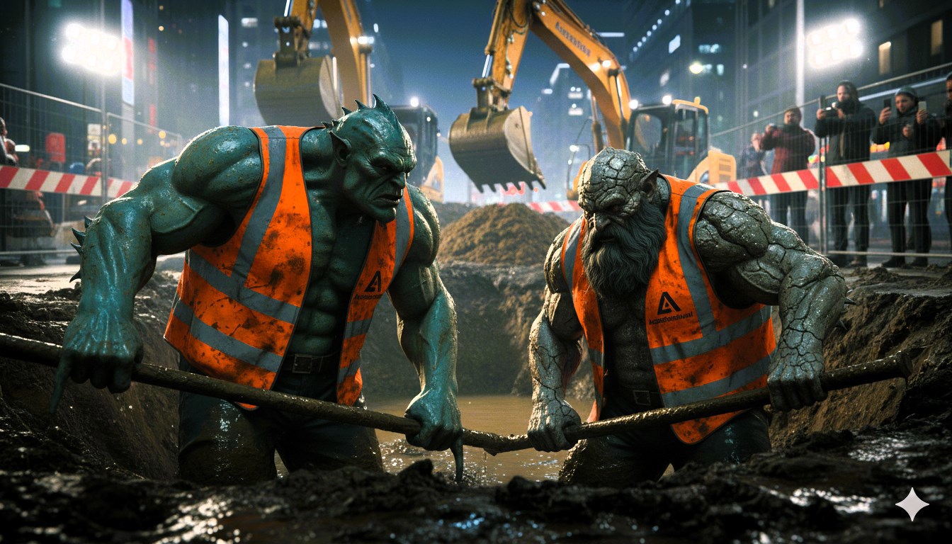 Посвящается всем коммунальщикам, особенно тем, кто трудится в котлованах, по колено в воде, днем и ночью, в любую погоду. Их самоотверженный труд достоин воспевания в сагах.