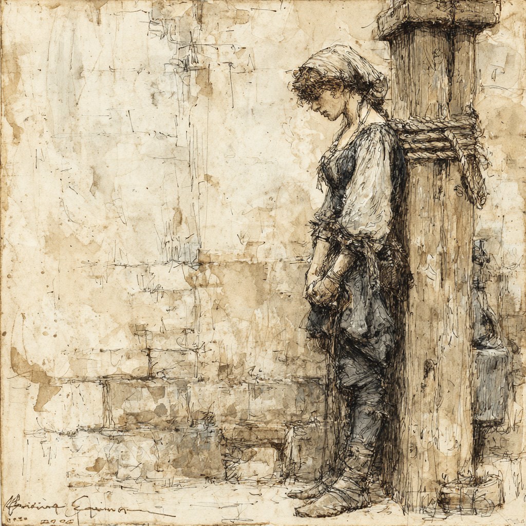 a young village girl in torn clothes of a peasant woman of the 15th century is tied to a wooden post. art by Charles Dana Gibson --chaos 10 --profile iomhvnn --stylize 300