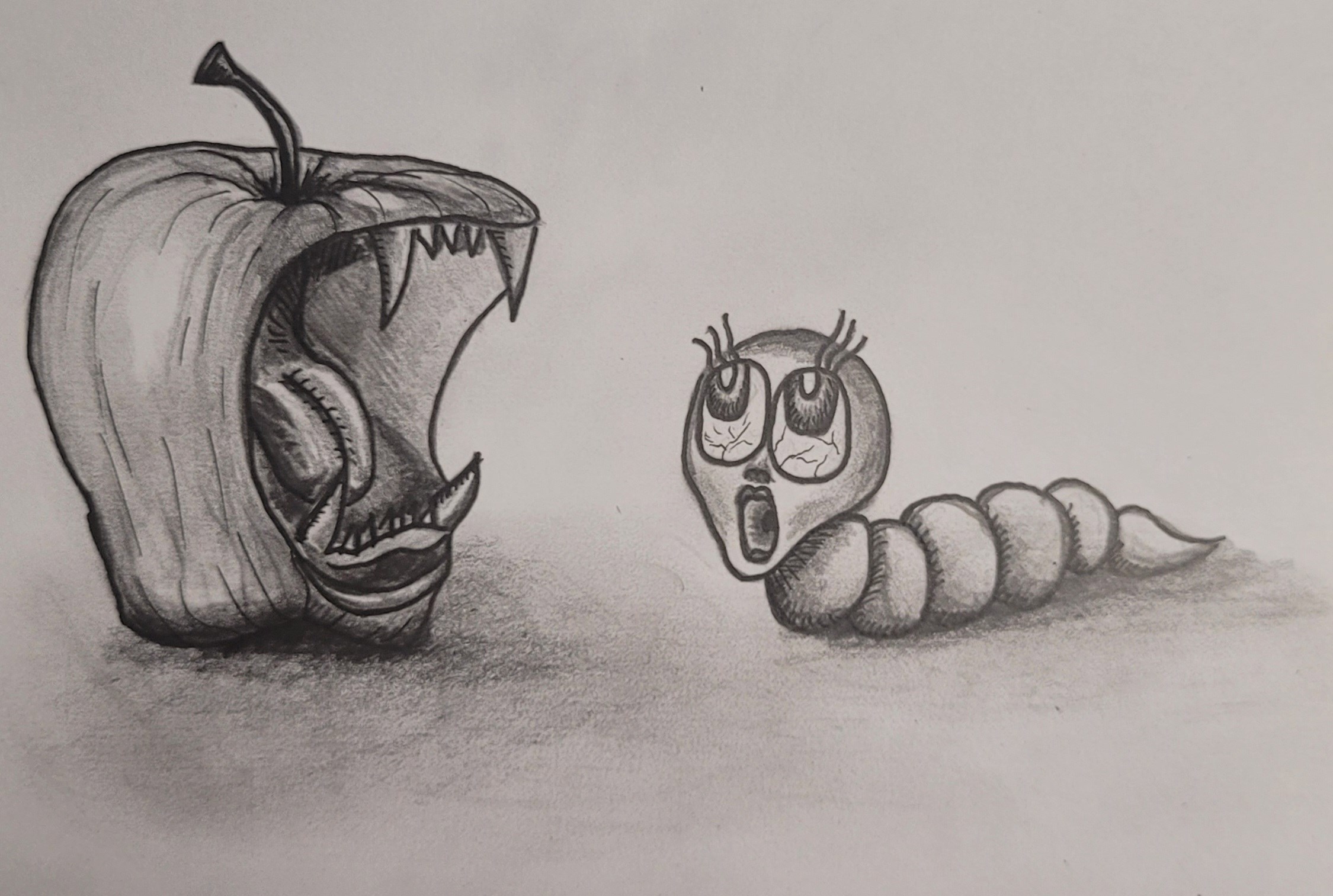Inktober 2025. День 16. Ошибка. Промах. Просчет Автор: Jain Solvaty яблоко, мутанты, гусеница, рисунок, инктобер 43 Пожаловаться