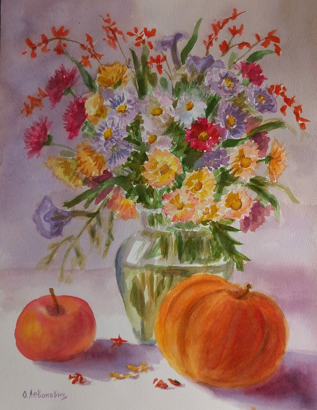 Букет октября Автор: Ольга Левонович Всё букет свой рисую, пока жив. Онлайн-курс "Цветовидение". Тема гармонии. Акварель на хлопковой бумаге 30х40. акварель 26 Пожаловаться