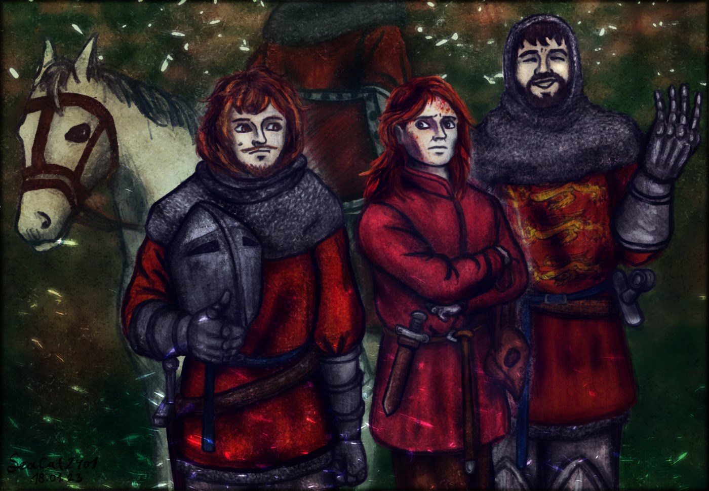 Майло (в середине), чуткий Освин (слева) и безрассудный Болдуин (справа). Среди отряда, к которому он примкнул, Майло слыл безумным целителем - и в этом было больше правды, чем предубеждений. Он открыто и часто осуждал решения тех, кто главенствовал над ним.