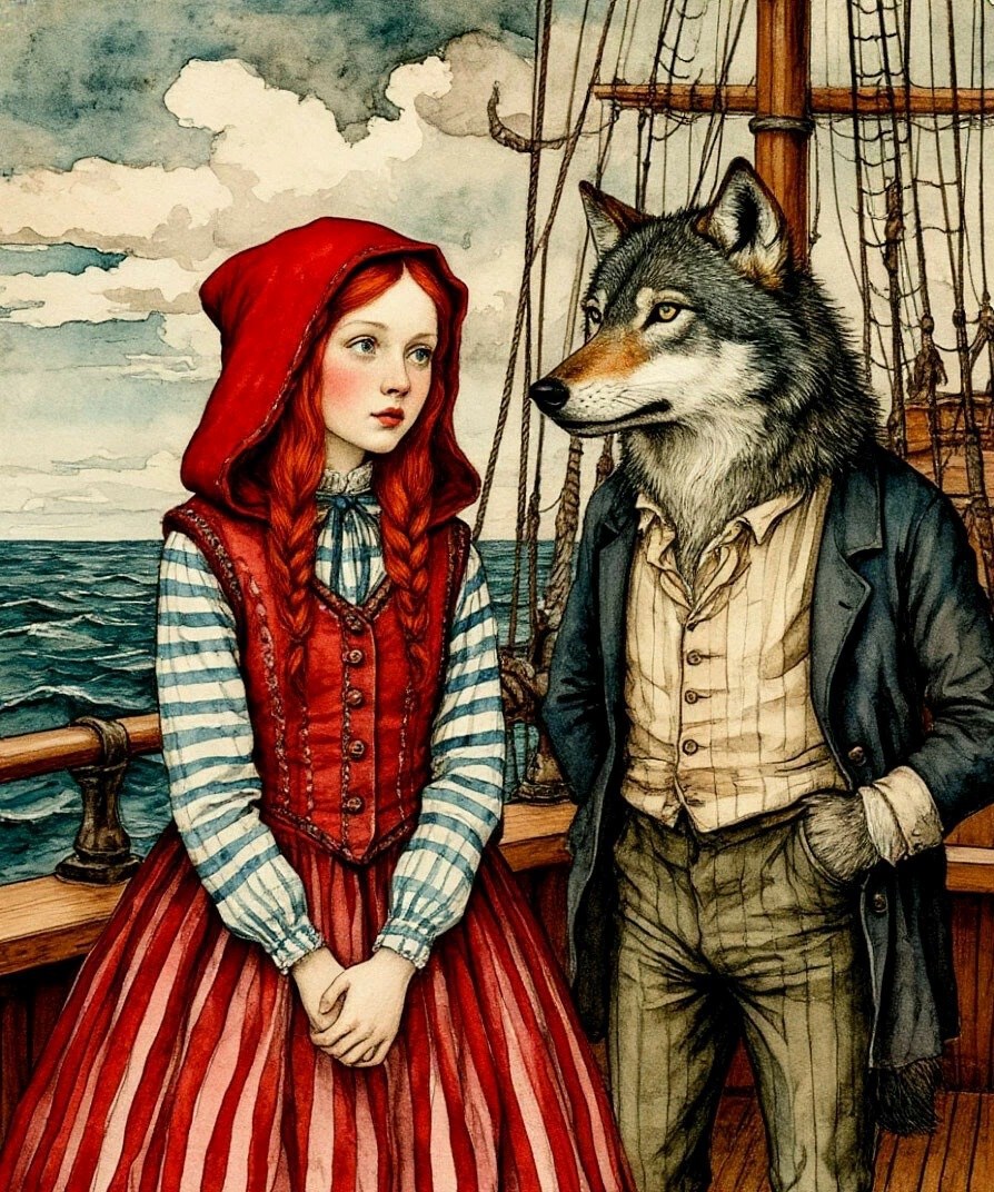 Красная Шапочка и Морской Волк Автор: Александр Самойлов Плывём к бабушке за пирожками... графика, рисунок, арт, компьютерная графика, нейросеть 131 Пожаловаться