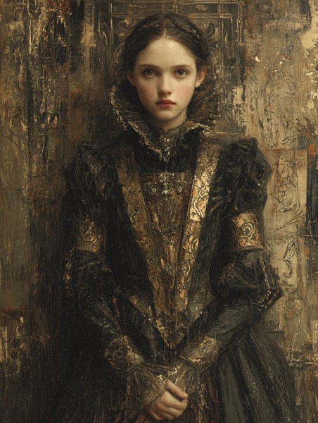 A slender fifteen-year-old princess in a black and gold 16th-century mourning dress. Her hair is dark gold, braided. Her eyes are large and blue. Her lips are pale pink. She resembles an elf. Art by Joseph Noel Paton --chaos 15 --ar 3:4 --profile iomhvnn --stylize 150