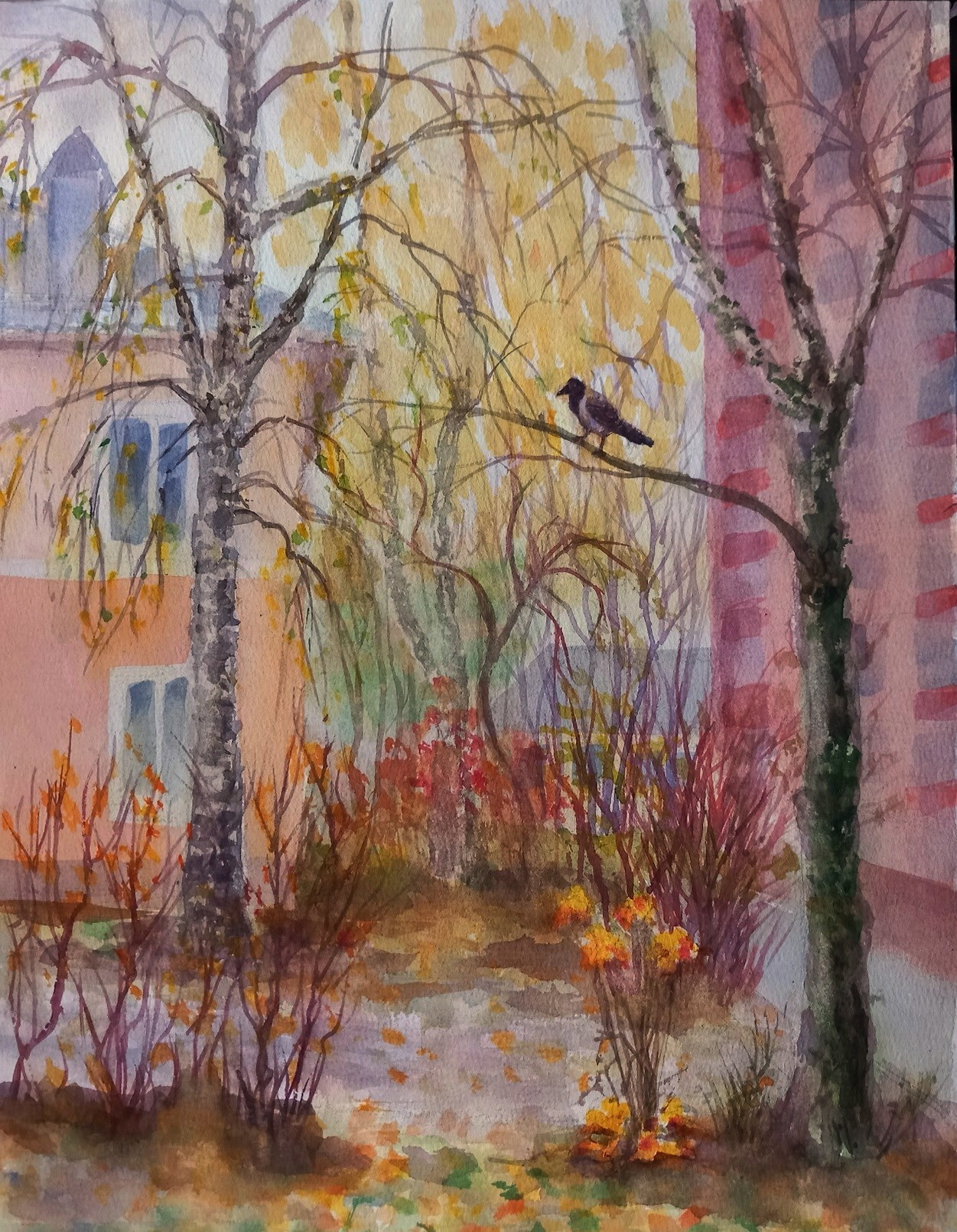 Что можно нарисовать, глядя в окно... Ворона реально прилетела! Онлайн-курс "Цветовидение". Тема гармонии. Акварель на хлопковой бумаге 30х40