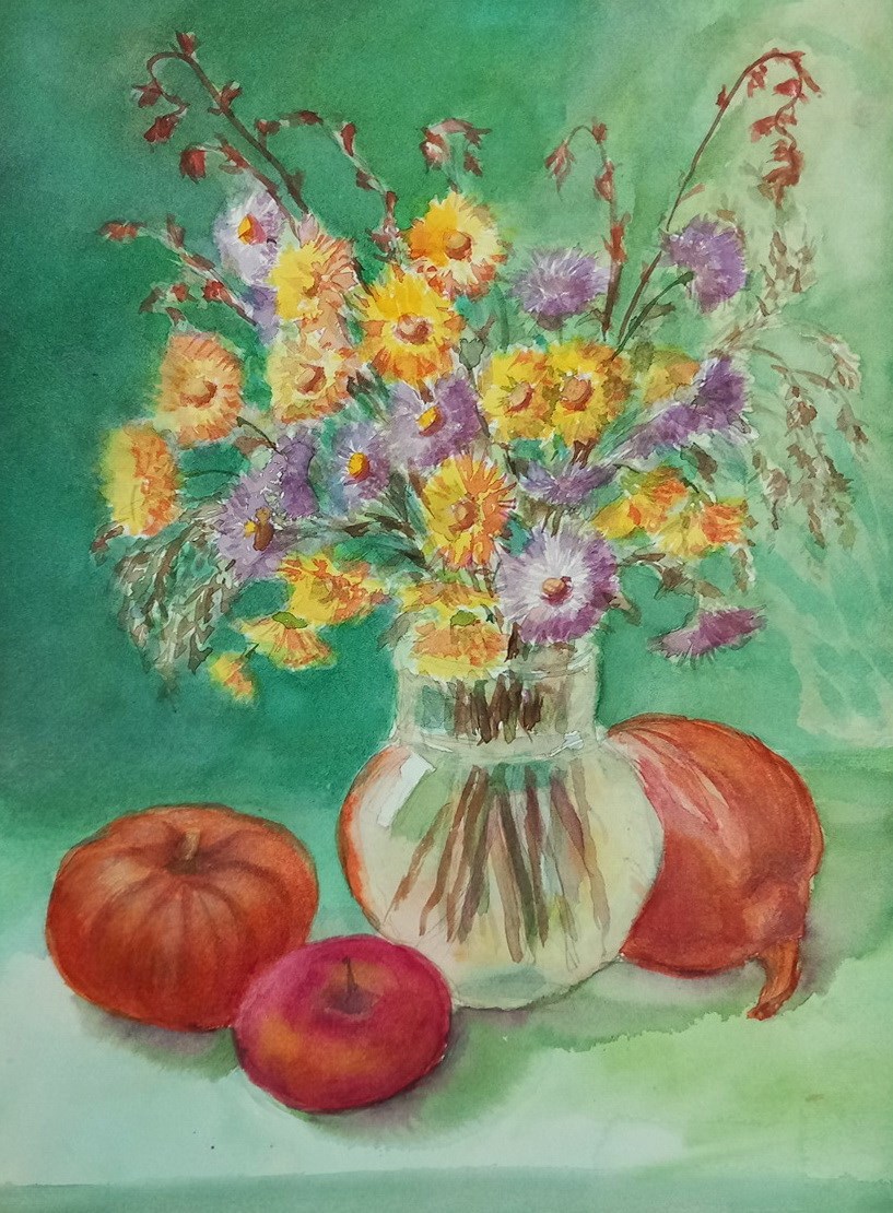 Букетик ещё жив, хотя поредел изрядно. В компании с рыжими тыквочками и красным яблоком. Онлайн-курс "Цветовидение". Акварель на хлопковой бумаге 30х40.