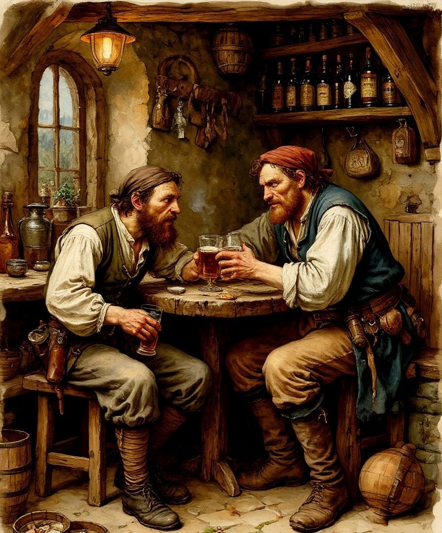 Три пива на двоих Автор: Александр Самойлов Сцена из трактирной жизни графика, арт, компьютерная графика, нейросеть, рисунок 85 Пожаловаться