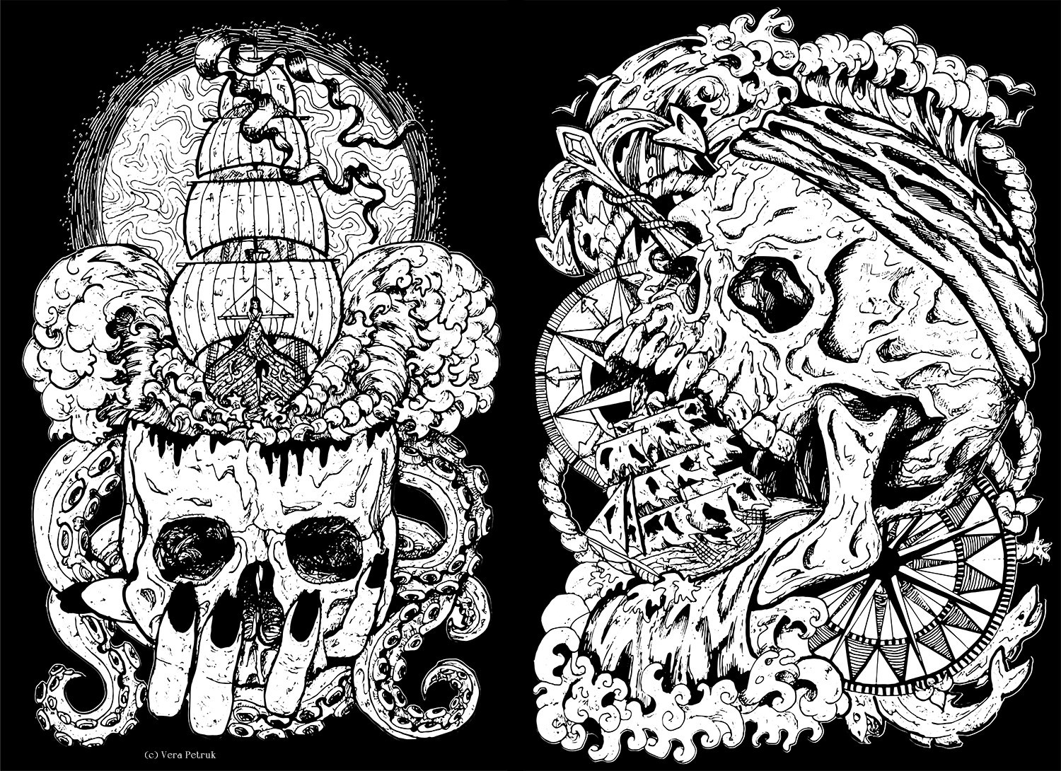 Попытка совместить любимые темы: море и готику. Такие вот морские черепа получились. Графика на бумаге.